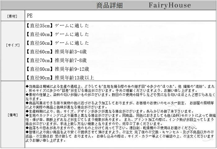 原産国:中国素 材:PE色:ホワイト ピンク レッド オレンジ グリーン レモンイエロー ライトブルー ダークブルー パープルサイズ:【直径35cm】ゲームに適した【直径40cm】ゲームに適した【直径50cm】ゲームに適した【直径60cm】推奨年齢3-4歳【直径70cm】推奨年齢7-8歳【直径80cm】推奨年齢9-12歳【直径90cm】推奨年齢13歳以上※人工測定では、1-3cmの誤差がありますので、ご了承ください! 注意事項: ※ 平置き素人採寸ですので多少の誤差はご容赦下さい。 ※ モニタ環境によって、商品の色合いが多少違う場合があります。 ※ 少々匂いがありますが、置いたままで2-3日くらいになくなりますので、ご安心ください。 ※ 発送時も簡易梱包の為、お受け取り時にたたみ皺が有ると思いますが、ご了承ください。