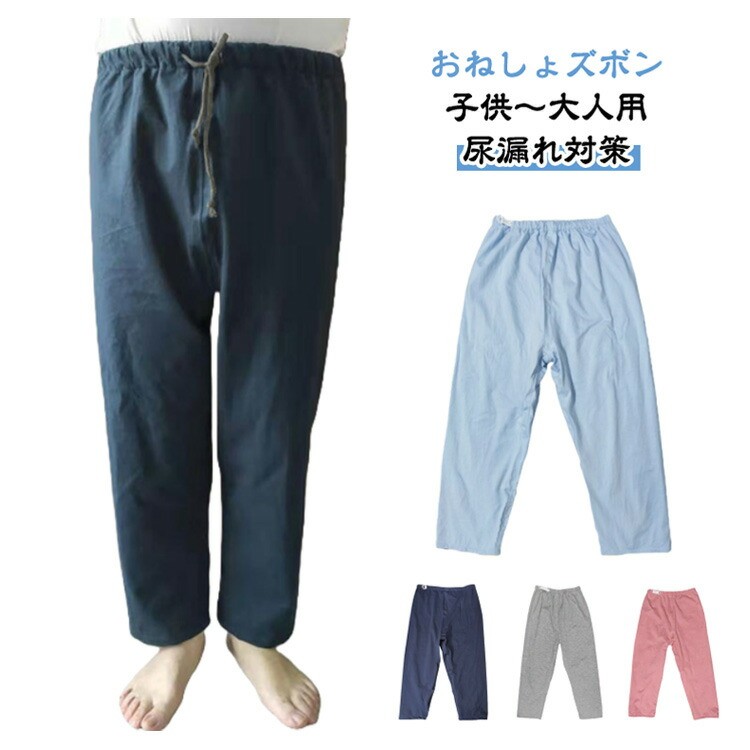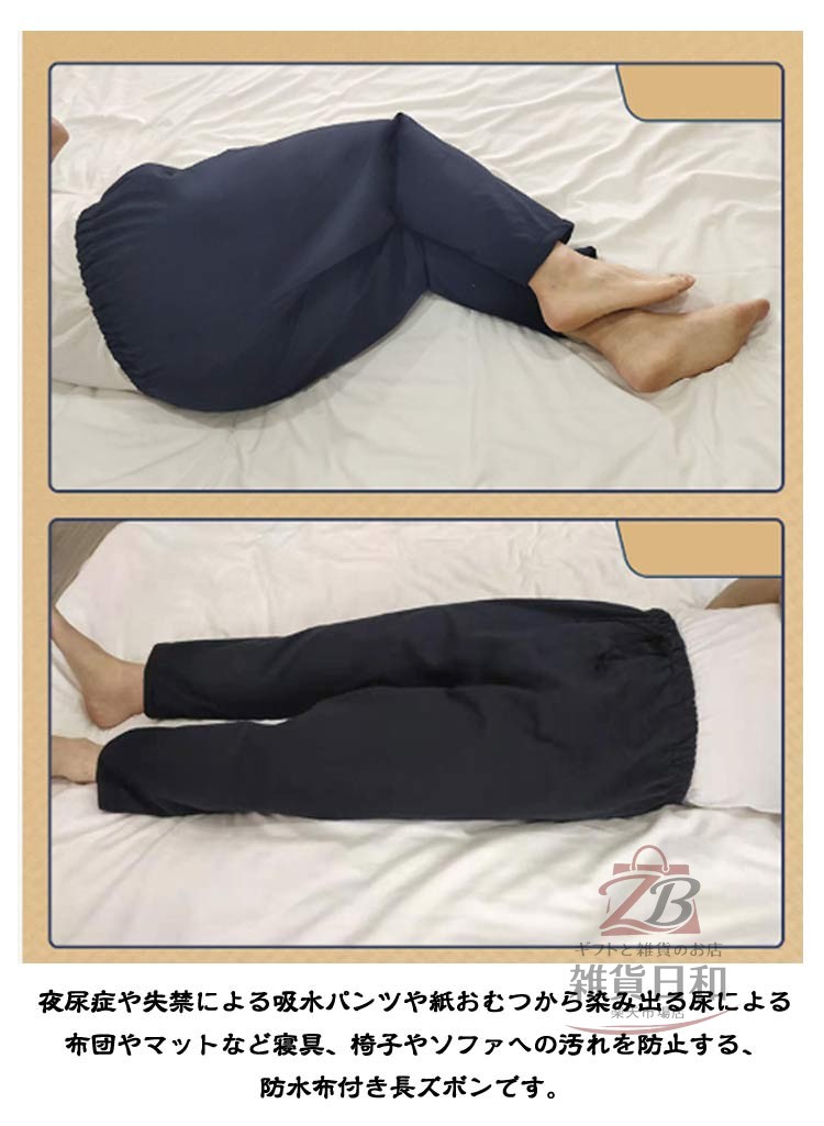 夜尿症や失禁による吸水パンツや紙おむつから染み出る尿による布団やマットなど寝具、椅子やソファへの汚れを防止する、防水布付き長ズボンです。