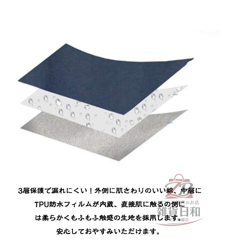 3層保護で漏れにくい!外側に肌さわりのいい綿、中層にTPU防水フィルムが内蔵、直接肌に触るの側には柔らかくもふもふ触感の生地を採用します。安心しておやすみいただけます。