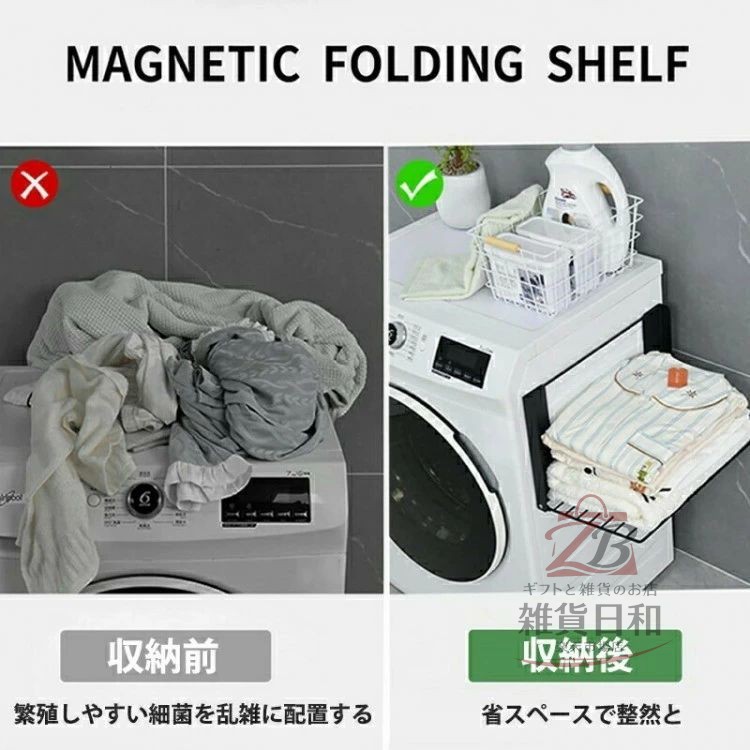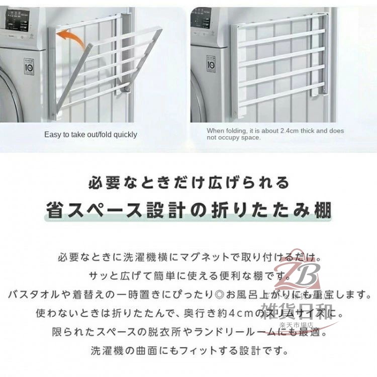 マグネットで洗濯機横に取り付け可能。サッと広げて簡単に使える便利な棚です。限られたスペースの脱衣所やランドリールームにも最適。洗濯機の曲面にもフィットする設計です。