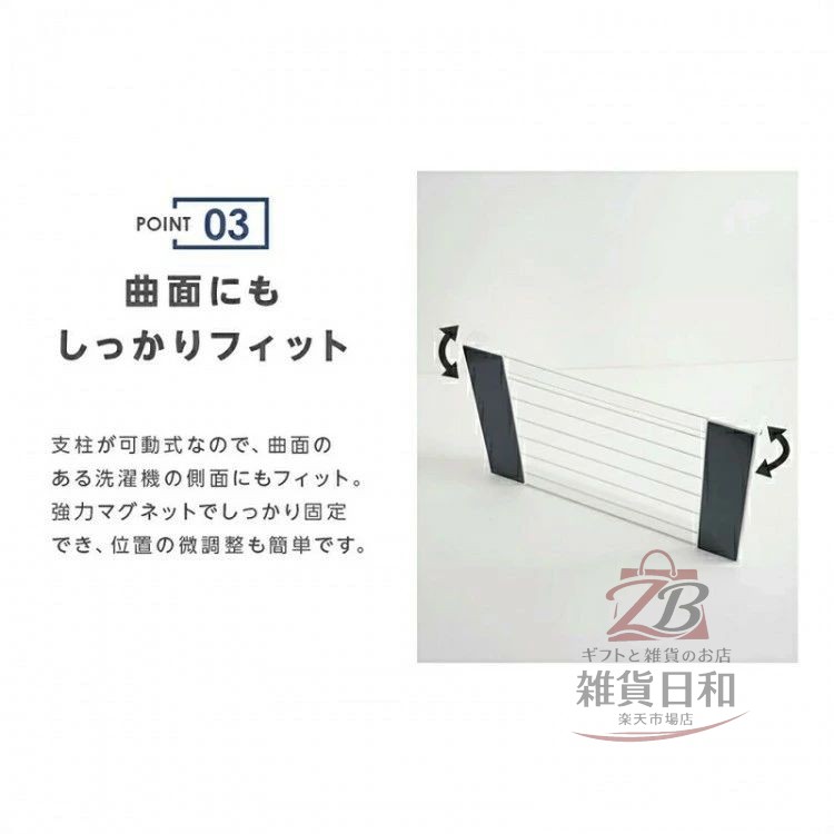 支柱が可動式なので、曲面のある洗濯機の側面にもフィット。強力マグネットでしっかり固定でき、位置の微調整も簡単です。