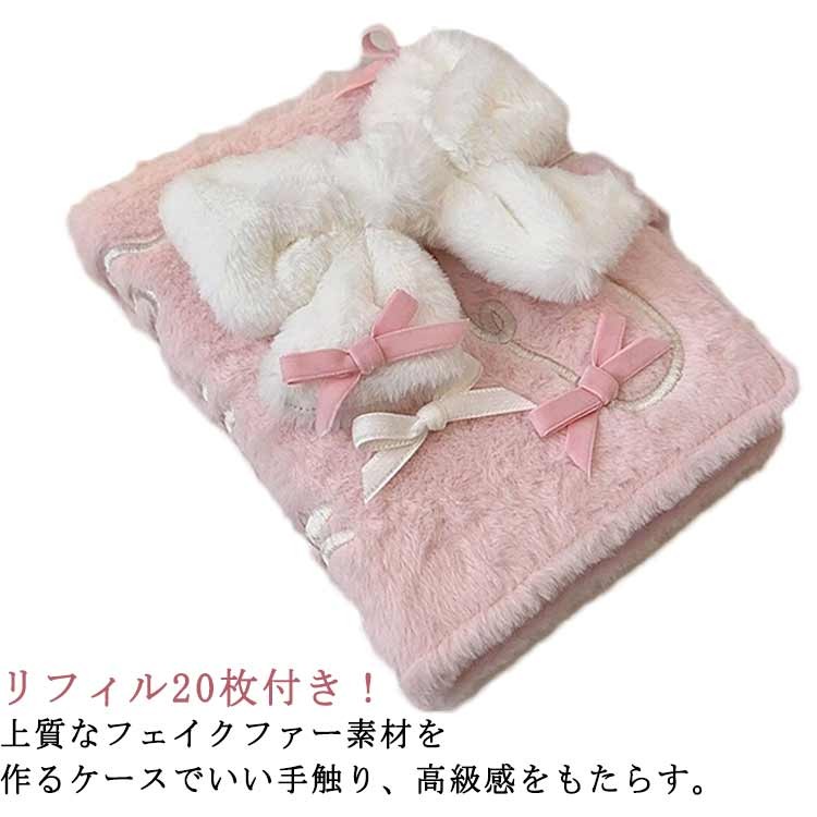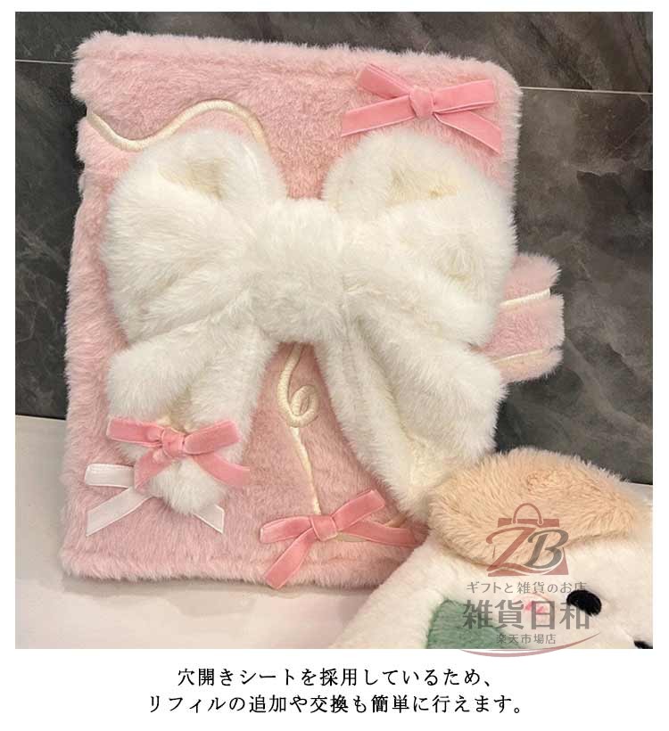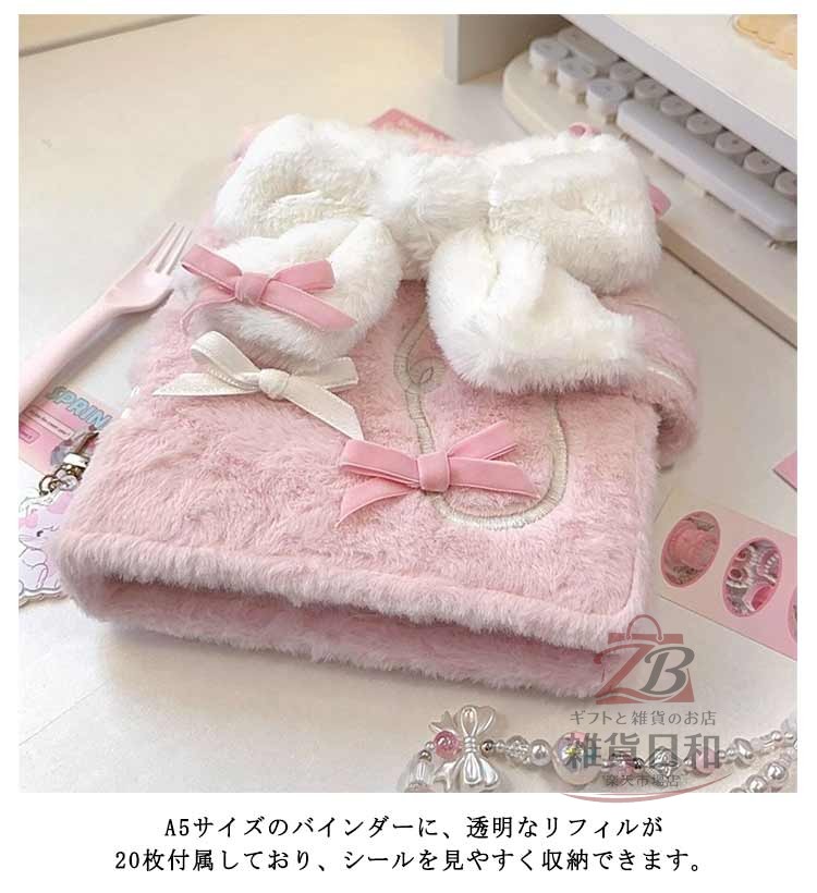 リフィル20枚付き。上質なフェイクファー素材のケースで良い手触りと高級感があります。手帳やアルバムとしても活用できる便利な収納グッズです。A5サイズのバインダーに透明なリフィルが20枚付属しており、シールを見やすく収納できます。推し活やDIY活動にもぴったりです。穴開きシートを採用しているため、リフィルの追加や交換も簡単に行えます。