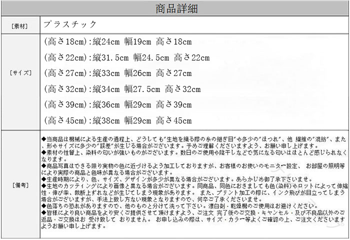 原産国:中国素 材:プラスチック色:ページュ(高さ18cm) モカ(高さ18cm) ページュ(高さ22cm) モカ(高さ22cm) ページュ(高さ27cm) モカ(高さ27cm) ページュ(高さ32cm) モカ(高さ32cm) ページュ(高さ39cm) モカ(高さ39cm) ページュ(高さ45cm) モカ(高さ45cm) サイズ:(高さ18cm):縦24cm 幅19cm 高さ18cm(高さ22cm):縦31.5cm 幅24.5cm 高さ22cm(高さ27cm):縦33cm 幅26cm 高さ27cm(高さ32cm):縦34cm 幅27.5cm 高さ32cm(高さ39cm):縦36cm 幅29cm 高さ39cm (高さ45cm):縦38cm 幅29cm 高さ45cm 耐荷重:60kg以内平置き採寸となりますので、1-3cmの誤差についてはご容赦下さい。※注意:※入荷時期により生地の色味、光沢感など若干違いが出る場合も御座いますが、不良品とは異なりますので、予めご了承頂けますようお願い致します。 ※PC環境・光の具合により、色や素材のイメージが写真と若干異なる場合がございます。※モデル・写真に使用されているアクセサリー・小物は別途記載が無い限り付属いたしません。