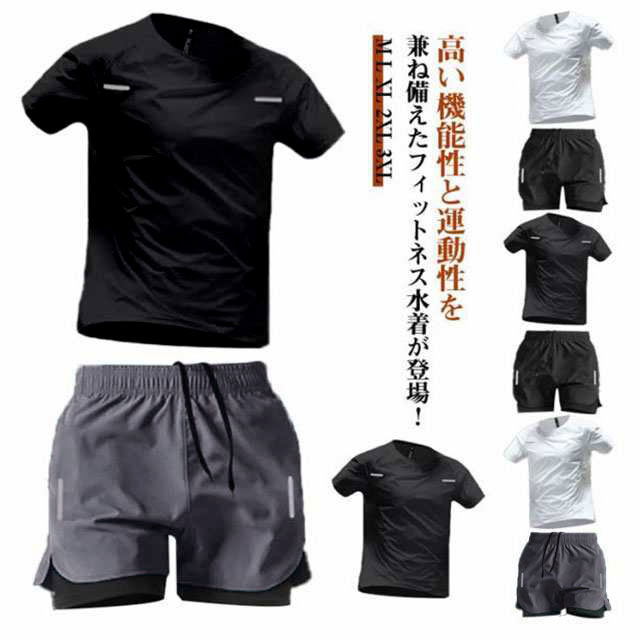 ラッシュガード 水着 メンズ 上下セット スポーツウェア フィットネス 半袖 体型カバー 水陸両用 2点セット サーフパンツ UVカット 紫外線対策 UV対策 水泳 競泳水着 ビーチ スイミング 競泳