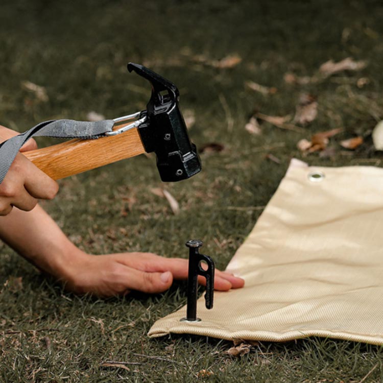 【ハトメ付き】四隅にはハトメを配置し、ペグでしっかりと固定できて、風の影響が最小限に抑えられます。焚き火をしている最中に、突然の強風に煽られにくく、焚き火台が倒れることを防げます。風が強くなければそのままでも大丈夫っちゃ大丈夫そうですが、万が一のために、特に軽めの焚き火台を持っている人はペグを打ち込むことを忘れずに!