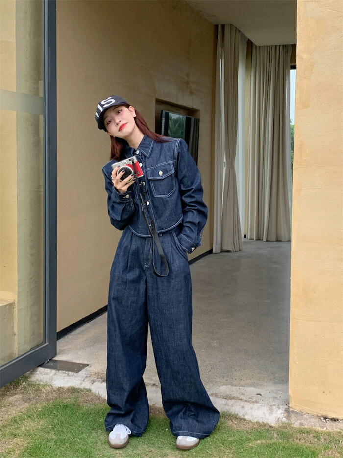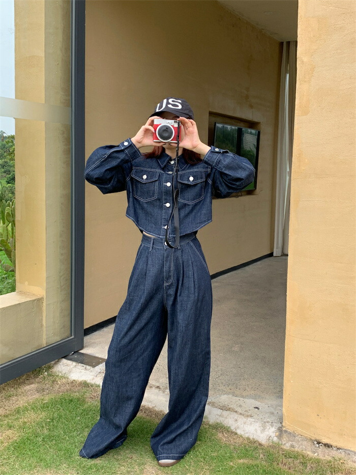 デニム セットアップ レディース 春秋 2点セット デニムセットアップ パンツスーツ デニムシャツ 長袖 ワイドパンツ タックパンツ ロングパンツ 無地 ゆったり 着痩せ おしゃれ カジュ 体型カバー