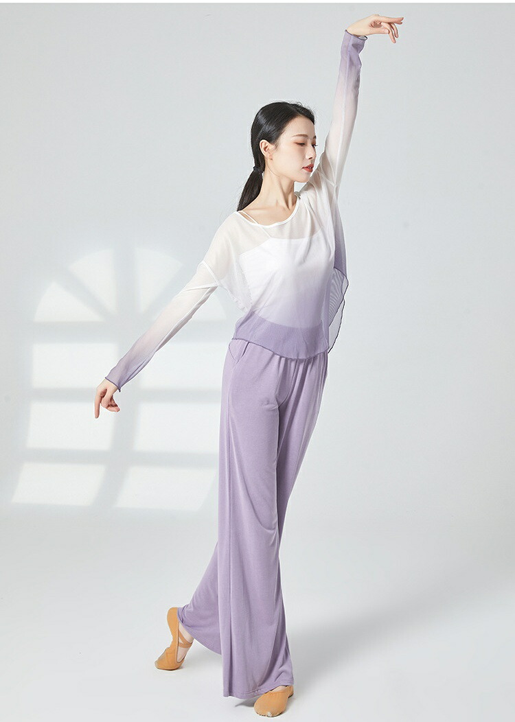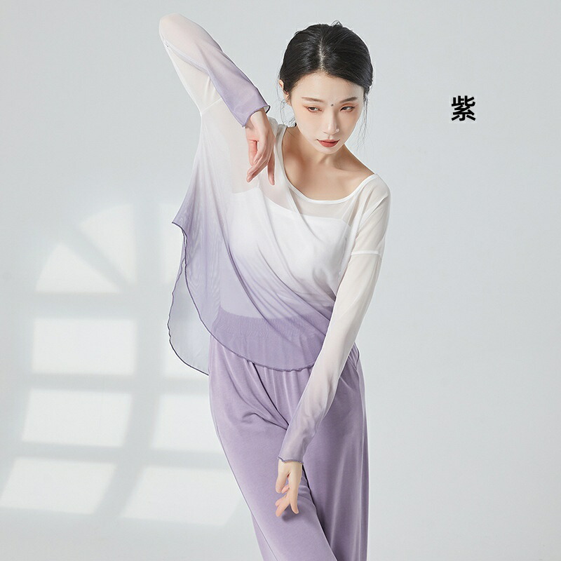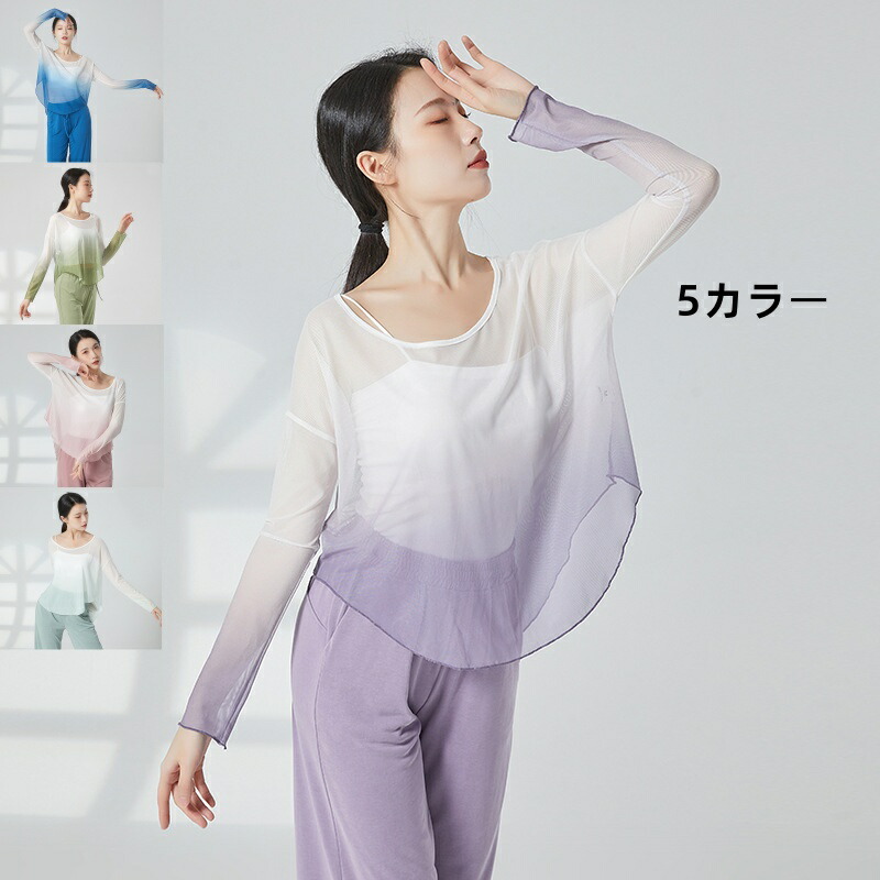 グラデーションダンストップス レディース 透け感 長袖ブラウス シースルーブラウス 大人用 ダンス衣装 ダンストップス ヨガウェア レッスン着 ダンス練習着 ヨガ服 団体服 リラックスヨガ エ 演出服