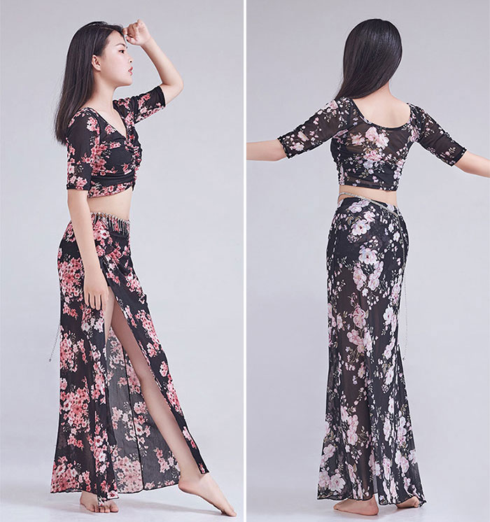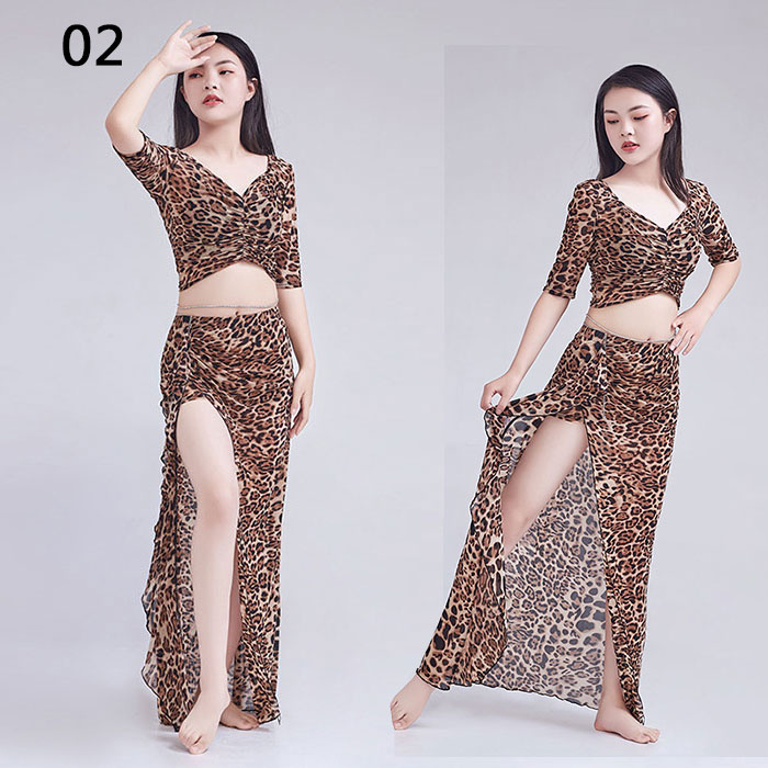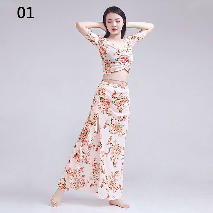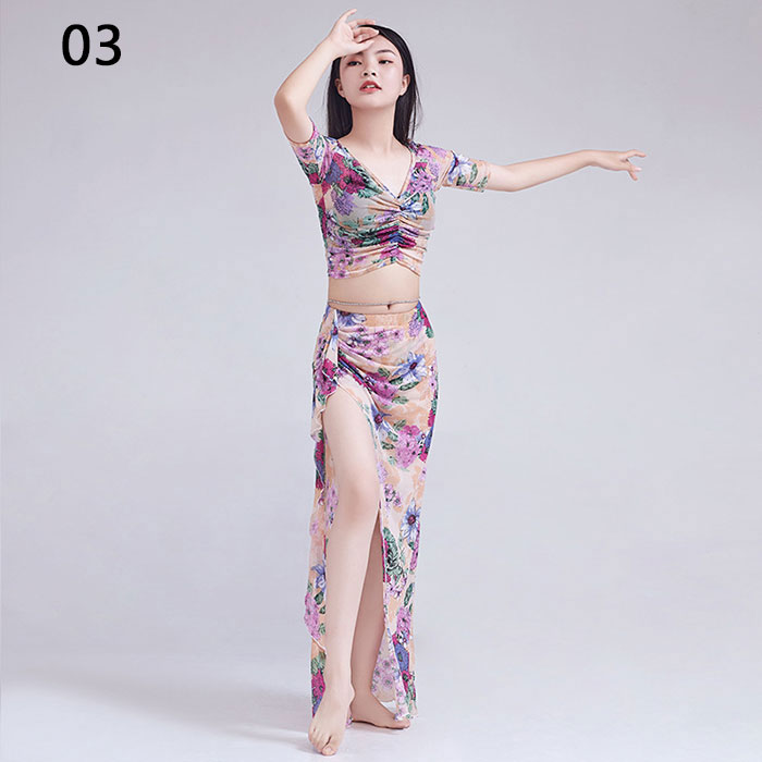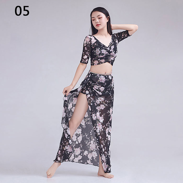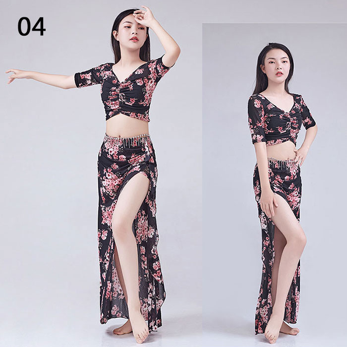 ベリーダンス衣装 6色 レディース 上下セット ベリーダンス レッスン着 半袖トップス Vネック ヘソ出し スリットスカート 花柄 豹柄 総柄 ステージ衣装 舞台衣装 ダンス教室 ダンス授業 練習着