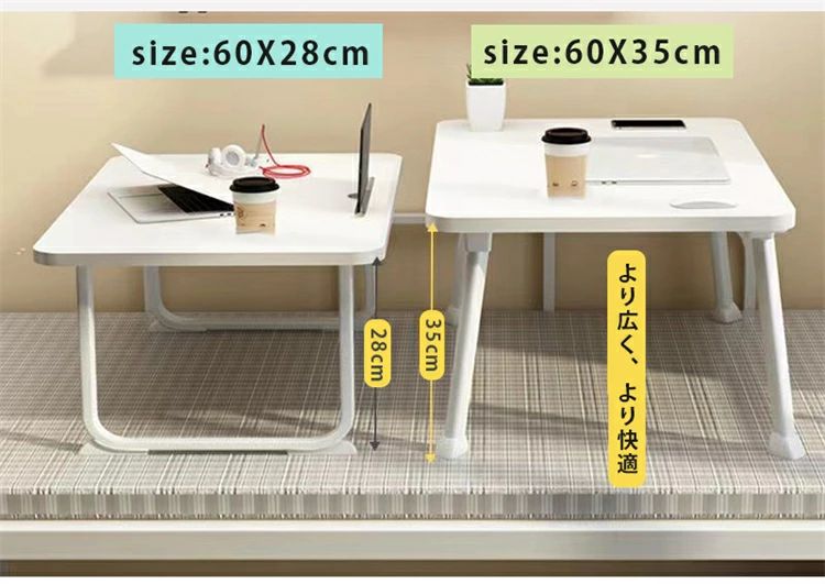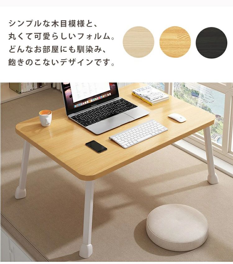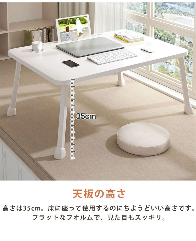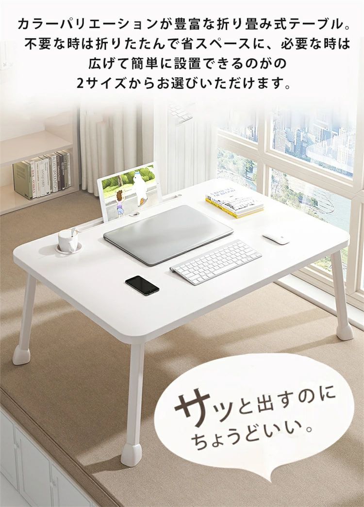 【様々なシーンで活躍!ちょうどいいサイズと安定感】 本体サイズは幅60cm×奥行40cm。ノートパソコンを広げての在宅ワークや、お食事、お子様の勉強机、サイドテーブルとしても使いやすい丁度良いサイズ感です。 また、耐荷重は約20kgとしっかりとした造り。安定感があり、安心して作業やお使いいただけます。シンプルなホワイトカラーは、和室・洋室を問わずどんなお部屋のインテリアにも馴染みます。