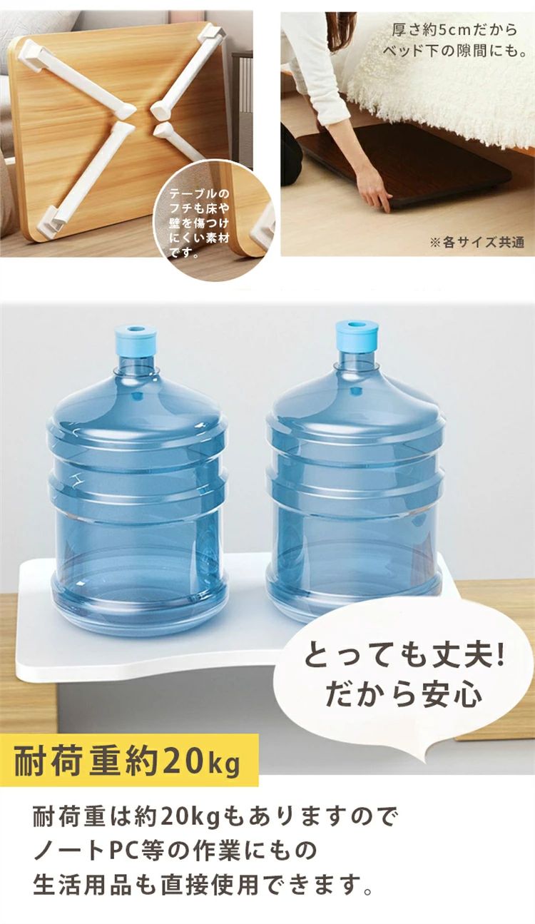 【設置不要の完成品!開けてすぐ使える便利なローテーブル】 この折りたたみテーブルは、届いたらすぐに使える完成品!特別な工具や組み立て作業は一切不要です。脚を開くだけで準備完了。使わない時はワンタッチでサッと折りたため、厚さわずか約5cmと非常にスリムになります。約2.5kgの軽量設計で、女性やお子様でも簡単に持ち運びや移動が可能。ベッドの下や家具の隙間など、わずかなスペースにもすっきり収納でき、お部屋を広く使えます。