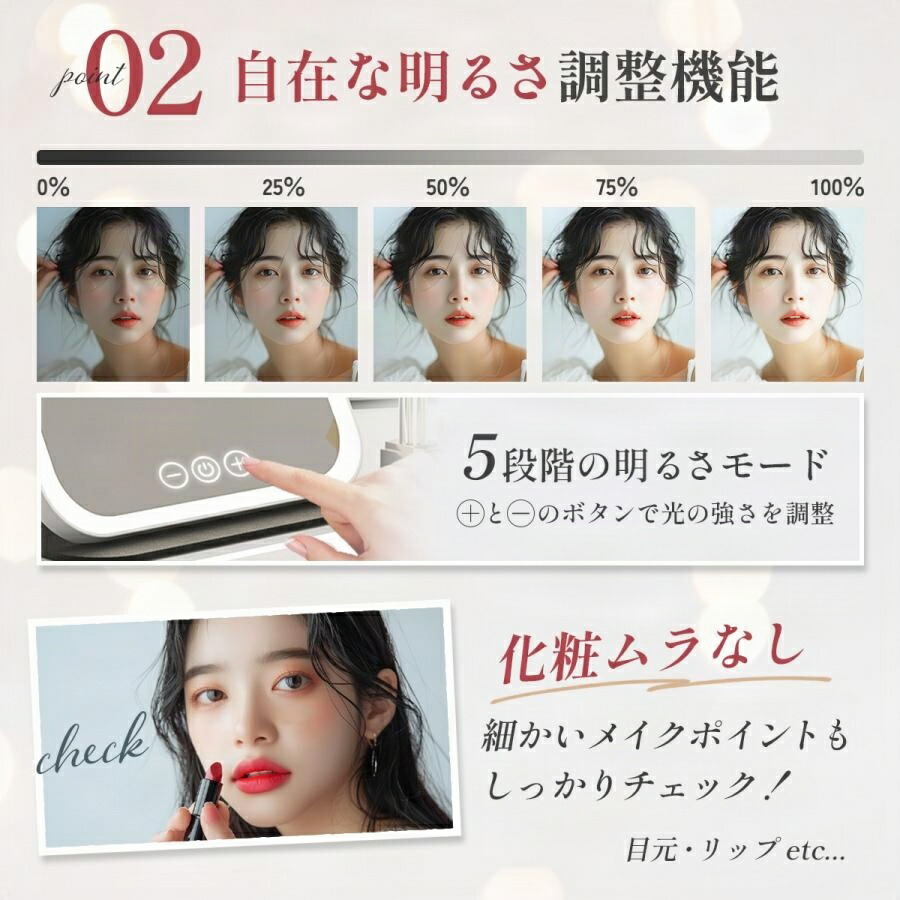 明るさを変更できるので細かいメイクポイントもしっかりチェックできます。