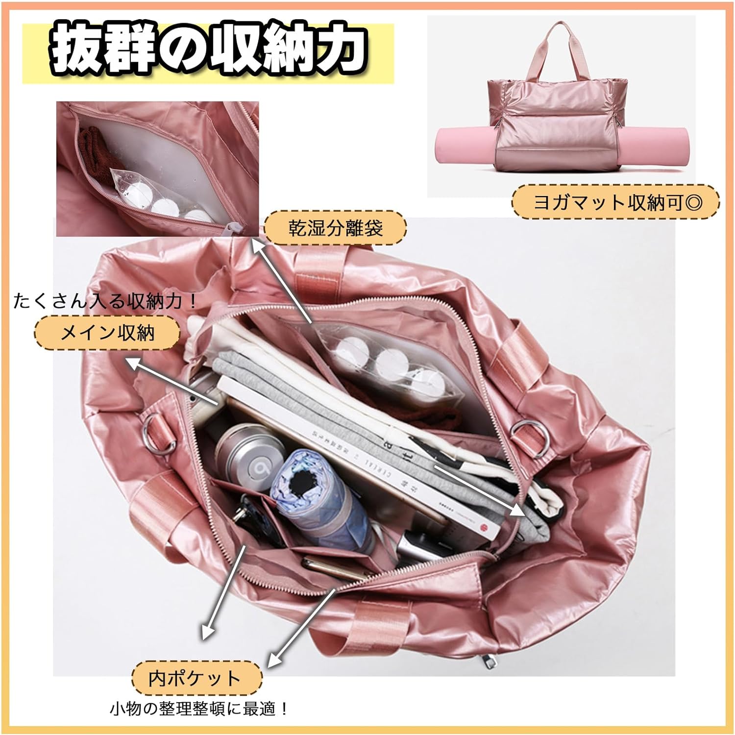 収納も豊富で、外側正面のにジッパーポケットは両サイドから取り出し可能な広々設計なので、たくさんの収納はもちろん、両サイドを開ければ、ヨガマットを収納することも可能です。内側にも小分けの収納ポケットがあるので、スマホ、鍵、など小さい荷物も綺麗に整理整頓できるので、バッグの中が散らかりません。また、乾湿分離ポケットも付いているので、プール、海水浴、温泉、旅行、スイミングなどで濡れたものも気にせず収納できるのがポイントです