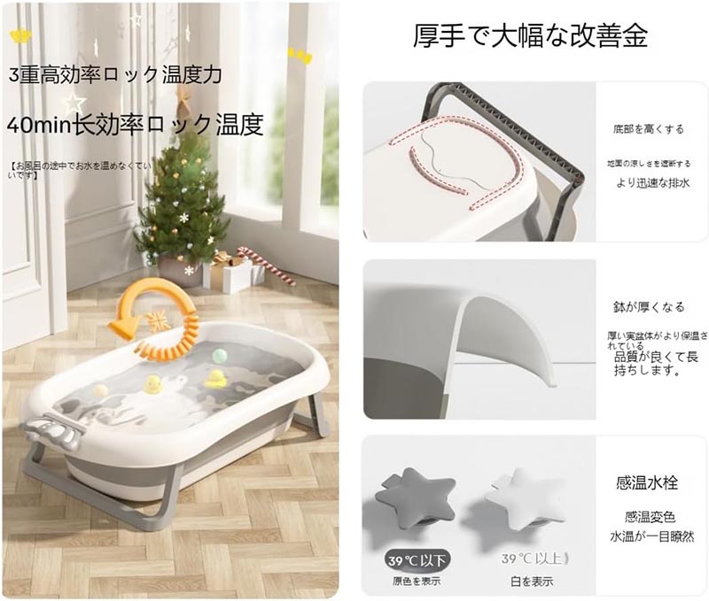 2.優れたトリプル温度ロック:独自のトリプル高効率温度ロック技術を採用し、熱損失を効果的に低減し、適切な水温を長時間維持し、赤ちゃんにとって暖かく快適な入浴環境を作り出し、風邪を引くリスクを回避します。お母さんたちに大きな安心を与えます。
