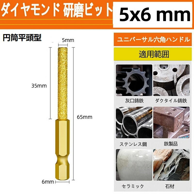 ダイヤモンド 研磨ビット ステンレス用 円筒平頭型5*6mm 円筒平頭型6*6mm 弾頭先丸型 円筒先丸型 テーパー型 砲弾型 ボール研削ヘッド