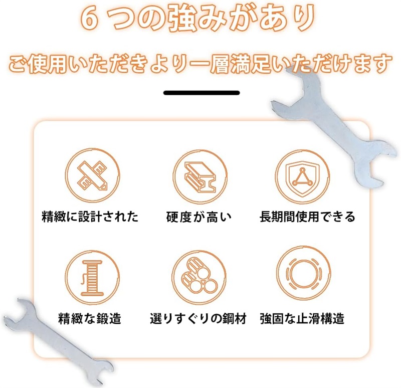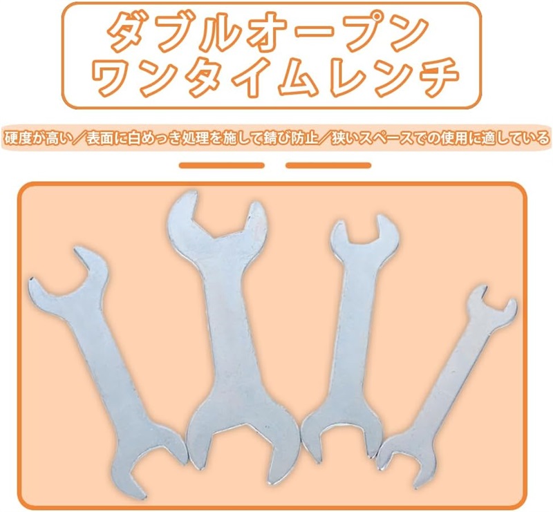 【両頭設計】:レンチセットの各本には2つの規格が付属し、多様なネジ作業に対応可能です。規格の刻印は明確に表示されています。