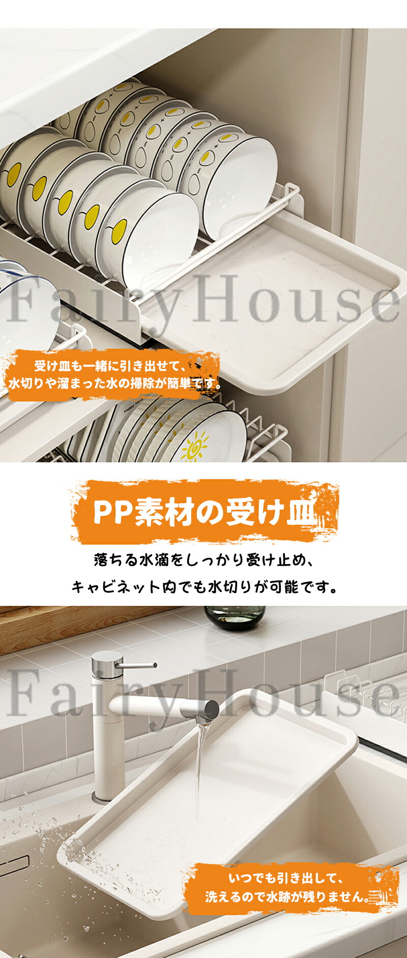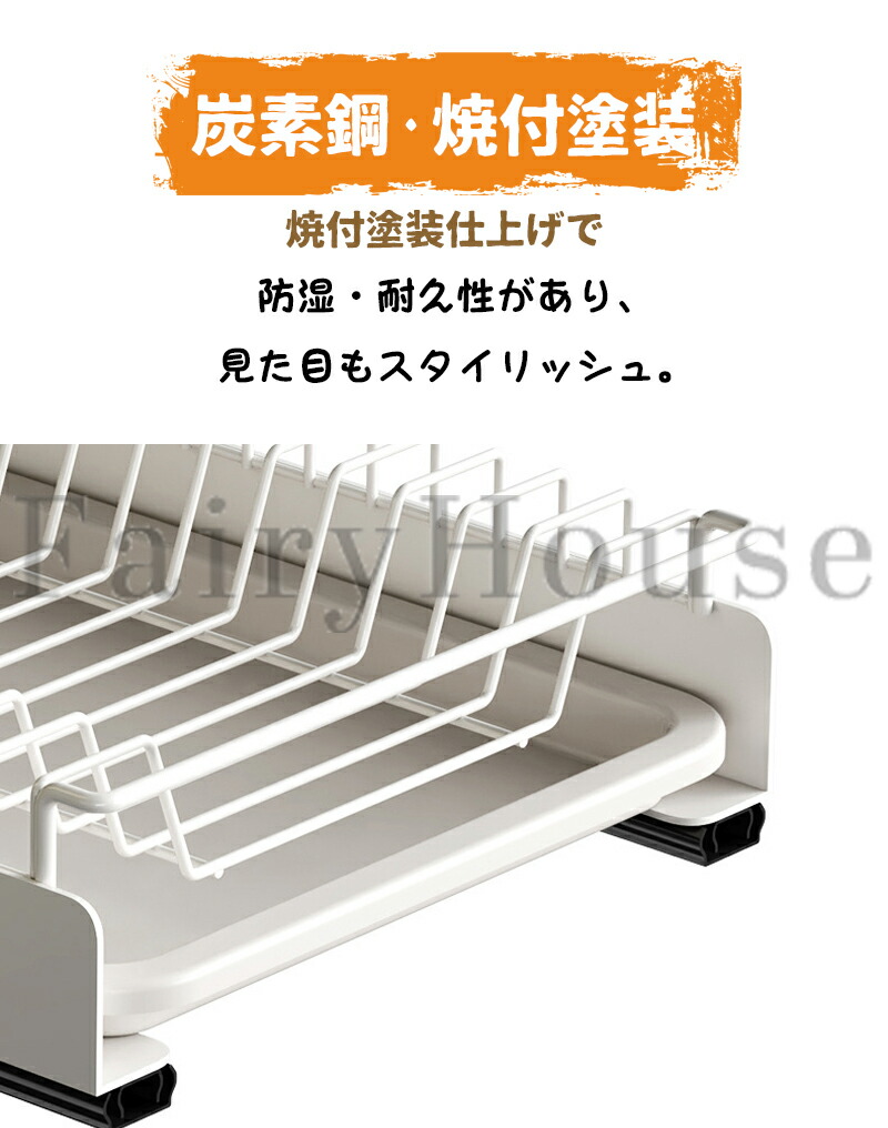 底に水受けトレーが付いているので、洗ったばかりの食器はそのまま入れて水切りでき、受け皿も自由に取り外せるので衛生面も安心。