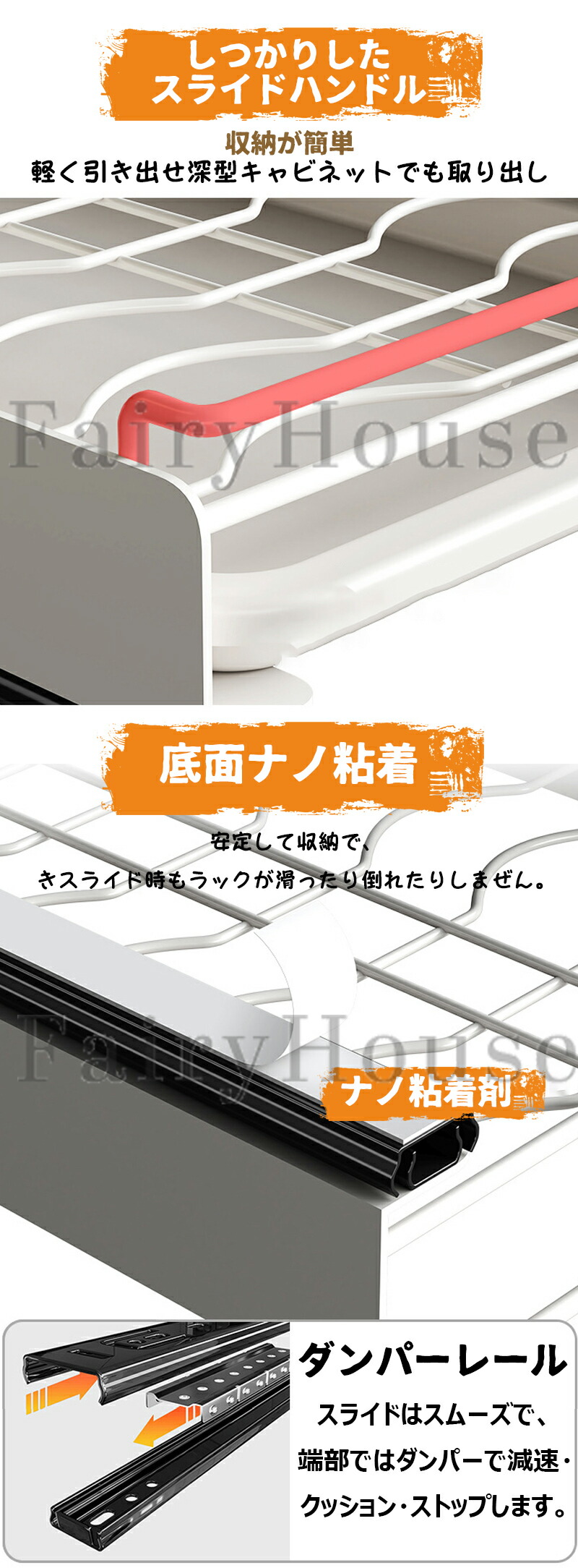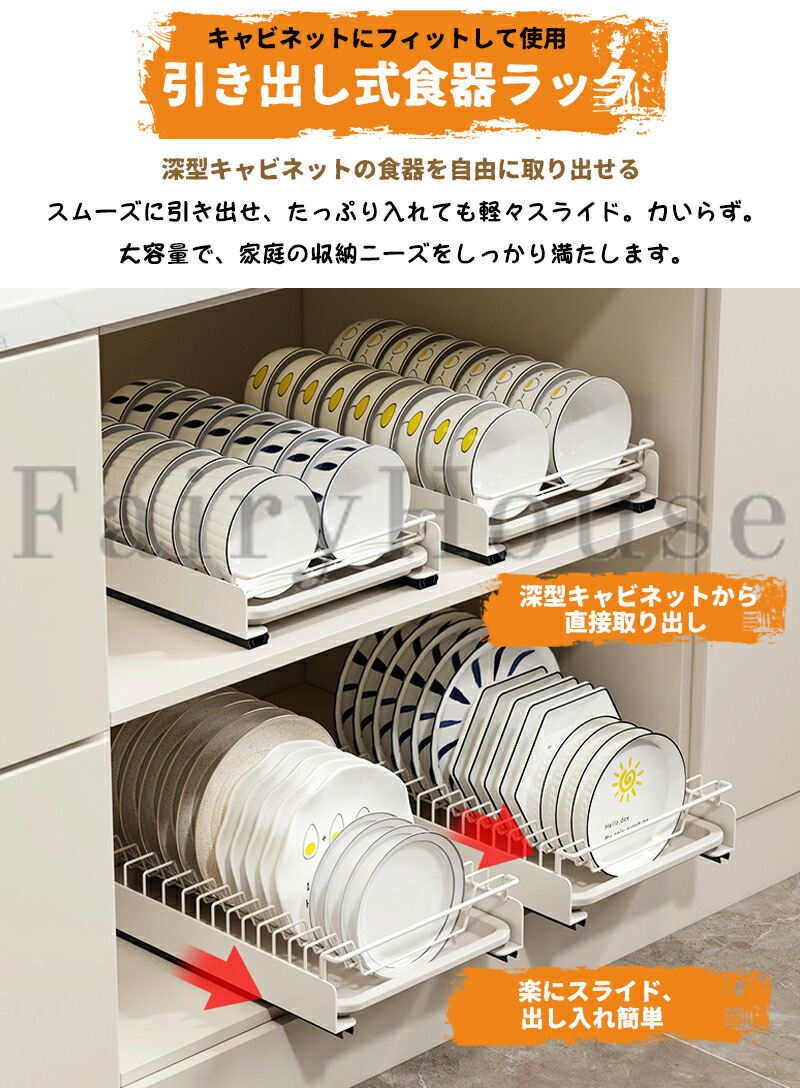 引き出しタイプで奥の物も簡単に取り出せ、シンク下などの奥が広い収納場所の活用におすすめです。