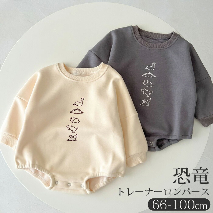 恐竜柄トレーナーロンパース 赤ちゃん キッズ ベビー マタニティ 通販 アイボリー グレー 66cm 73cm 80cm 90cm 100cm