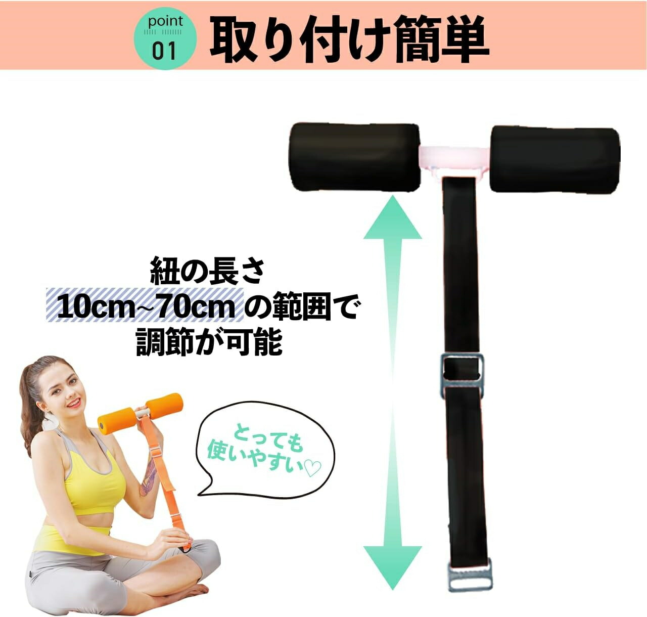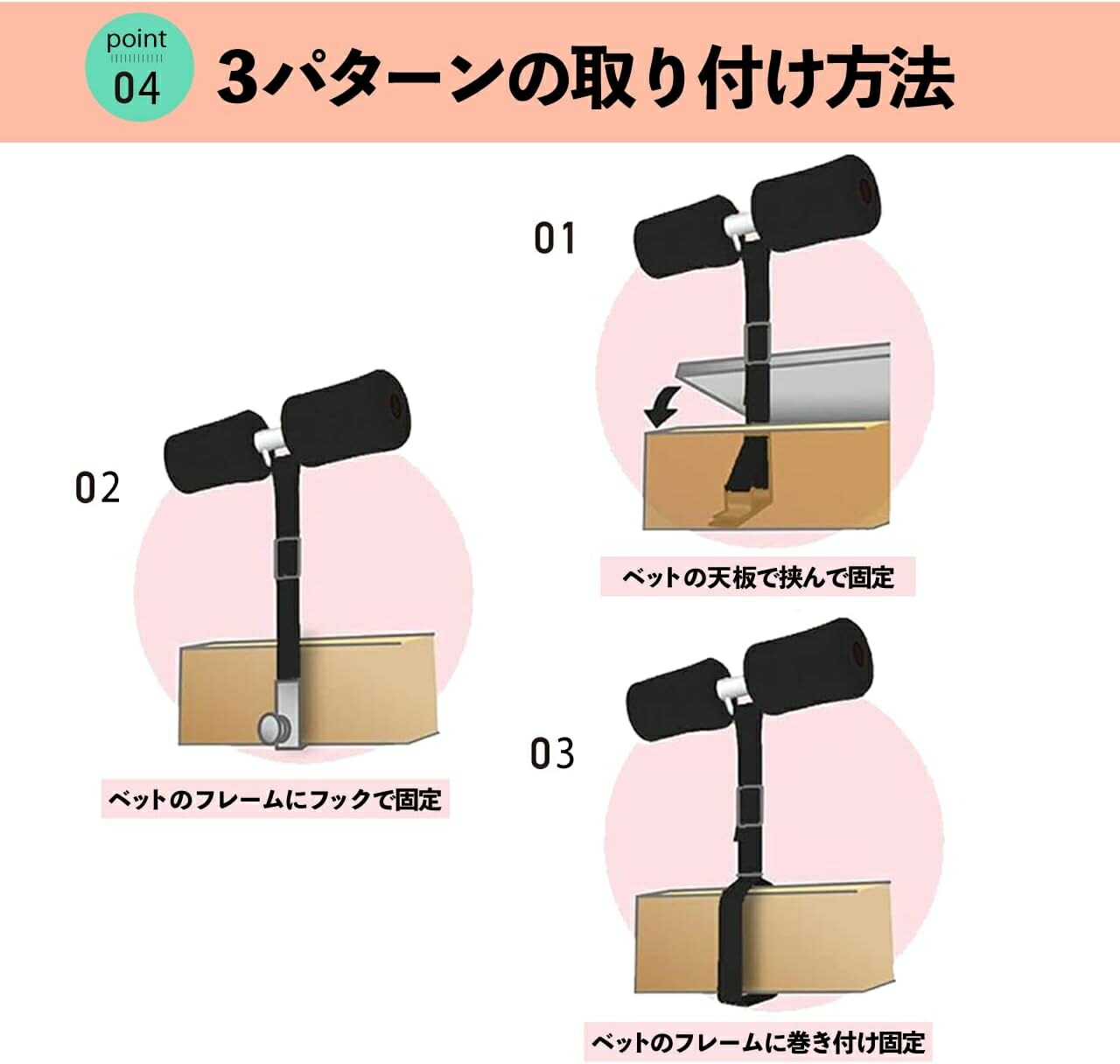 取り付け簡単:ベッドの天板に挟んだり、ベッドフレームにフックで固定したり、直接ベッドフレームに巻き付けて固定する3パターンでのお取り付けができる腹筋マシーン 足固定器具なので、ご自宅のベッドの形状などに合わせて簡単に取り付けができる仕様になっております。紐の長さも10cm~70cmの範囲で調節ができますので幅広く調整が可能です。