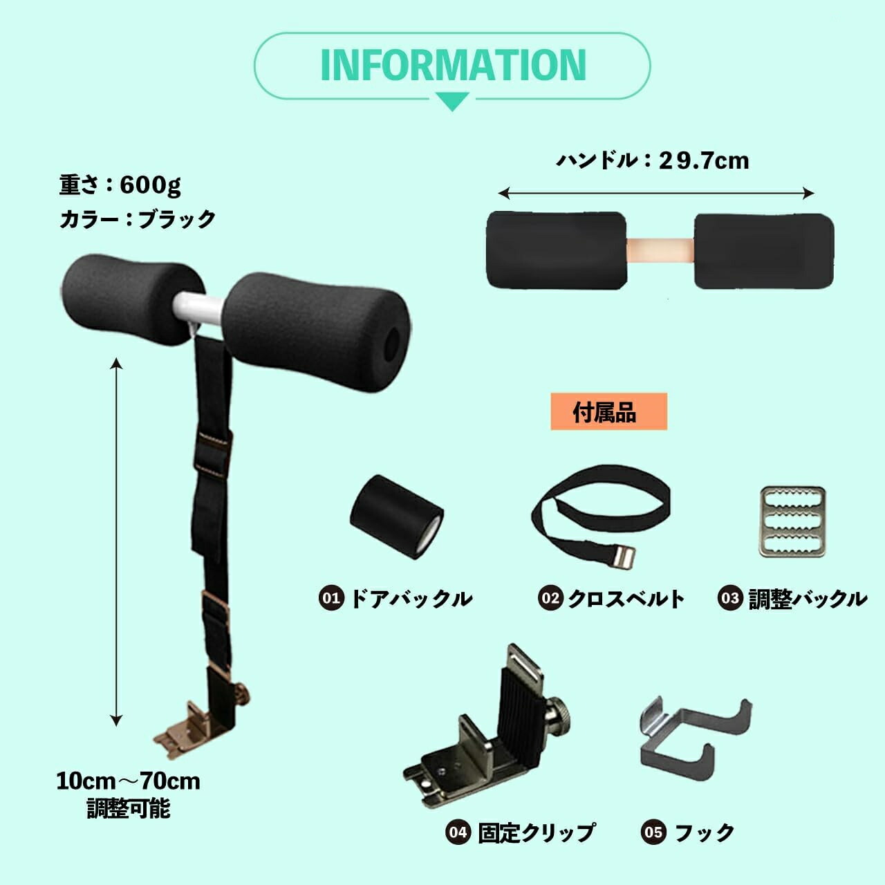 【商品仕様】セット内容:腹筋用足固定器具 ×1点 サイズ:幅 約29.7cm 紐の長さ 10cm~70cmの範囲で調節可能 重さ:約600g カラー:ブラック ※モニターの環境等により、色の見え方に若干差が生じる場合がございます。