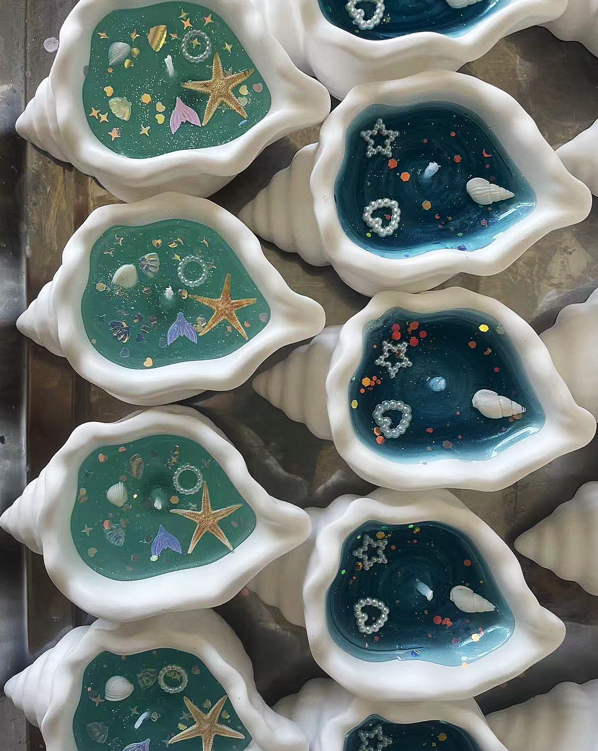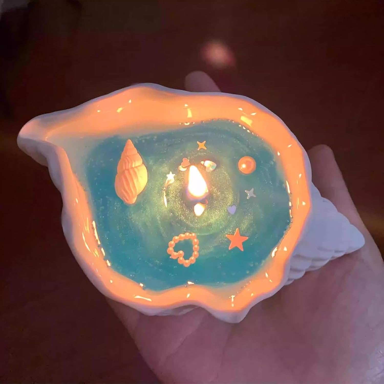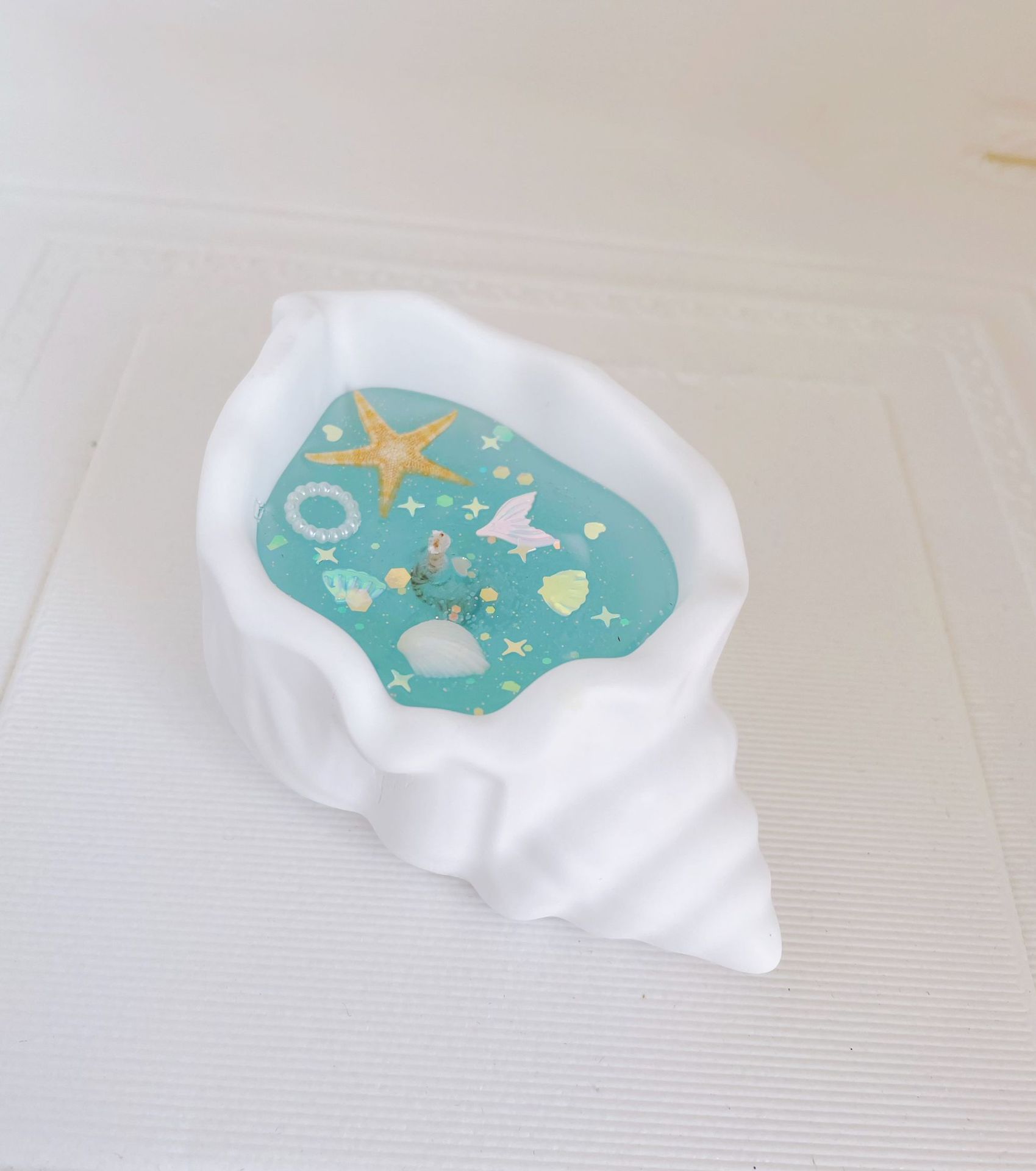 絶妙な巻き貝 - ヒトデと真珠の装飾で飾られたこの手作りの貝殻キャンドルは、本物の貝殻を使用して作られており、輝く青いワックスが特徴です。そのユニークで魅力的な美しさは、丁寧な手作業によって生み出されます。
