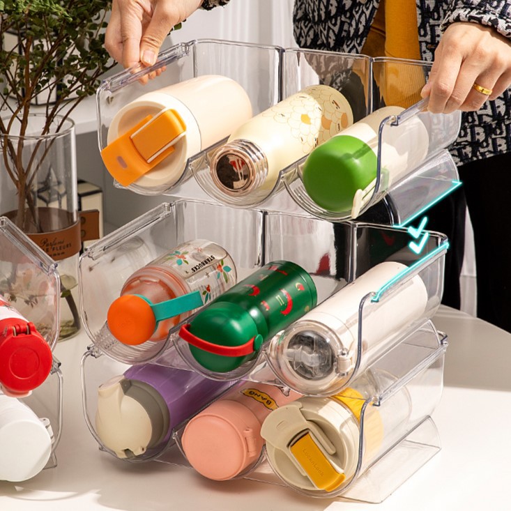【省スペース】重なり合う空間を最大限に有効活用し、縦の空間も有効活用でき、おしゃれに整理整頓!冷蔵庫のような狭いスペースでは、ボトルを立てて置くとボトル同士が邪魔にならず便利です。このウォーターボトルホルダーがあれば、ボトルの取り出しも楽々です。