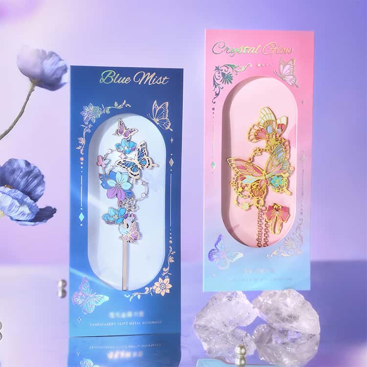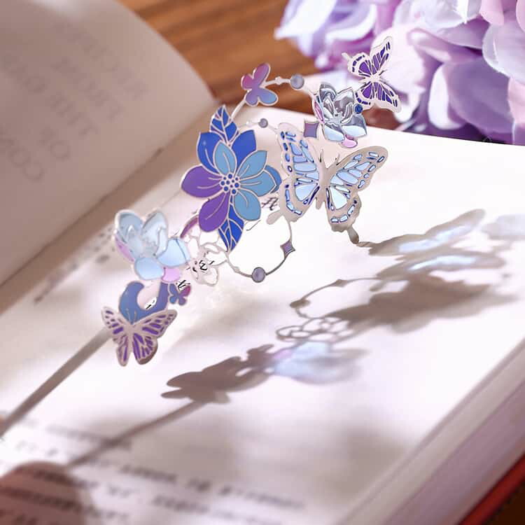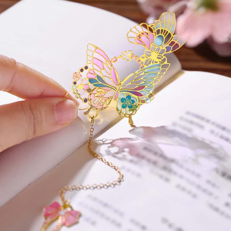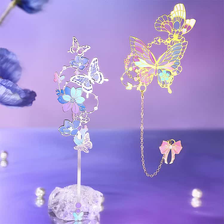 ステンドグラスを思わせる繊細なデザインが美しい、蝶モチーフの金属製ブックマーク2枚セットです。