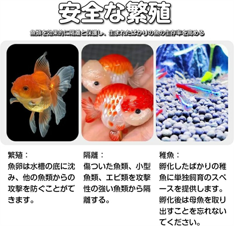 【多機能用途】産卵箱としてだけでなく、異なる品種の魚類の同時飼育、産卵魚・攻撃性魚類・負傷魚・病魚・エビ類の隔離にも使用可能。日常飼育ニーズに応え、育成・隔離・繁殖の三重機能を備えています。吸盤とフック付属で水槽に安定設置でき、省スペースかつ実用的です。