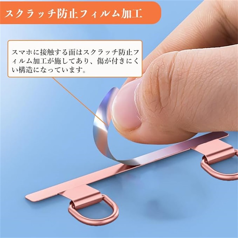 金属リングと本体の間での連結金属部分は折り曲がれて段差になり、ケースを装着したままに全然浮きにくい、この点を革新されて、従来の製品を装着した後に、ケースがやや浮きの問題点を解決し、便利さをアップさせます。更に0.4mmだけの薄さ、本ストラップホルダーを挟んだままに、何も装着しないような体験を実現されます。