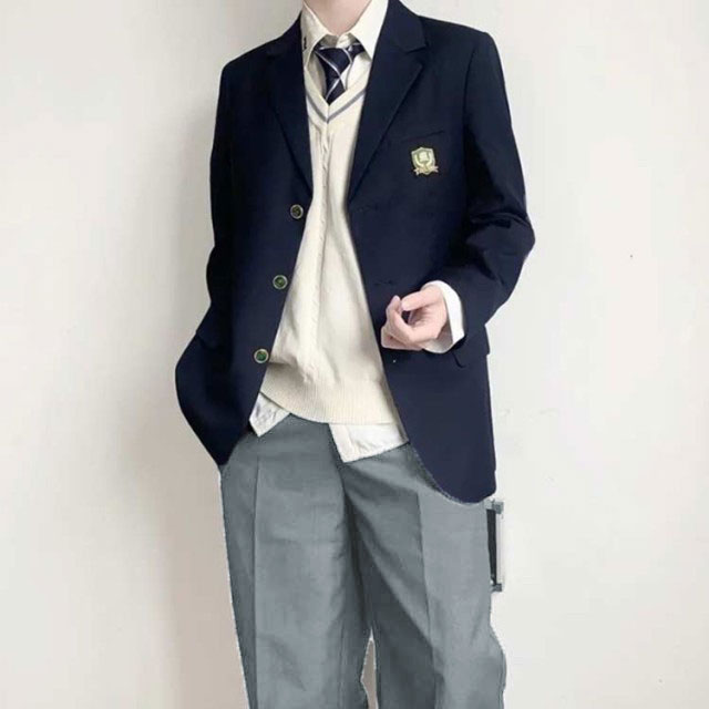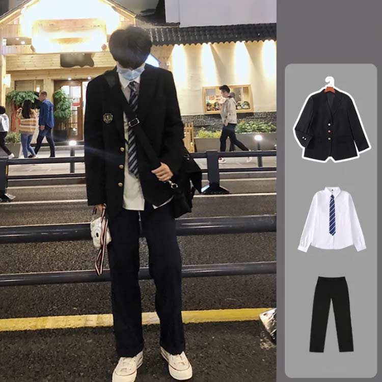 ジャケット・長袖シャツ・パンツ・ネクタイがセットになる学生制服。