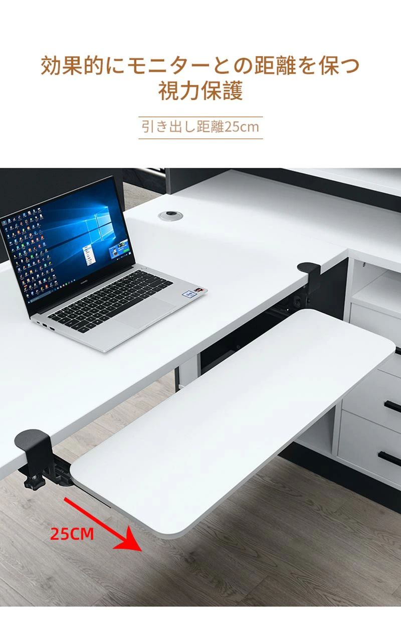 ▲デスク下キーボードトレイをデスクの端から最大25cmまでスムーズに拡張でき、人間工学に基づいたセットアップを実現し、手首、首、肩へのストレスを和らげます。