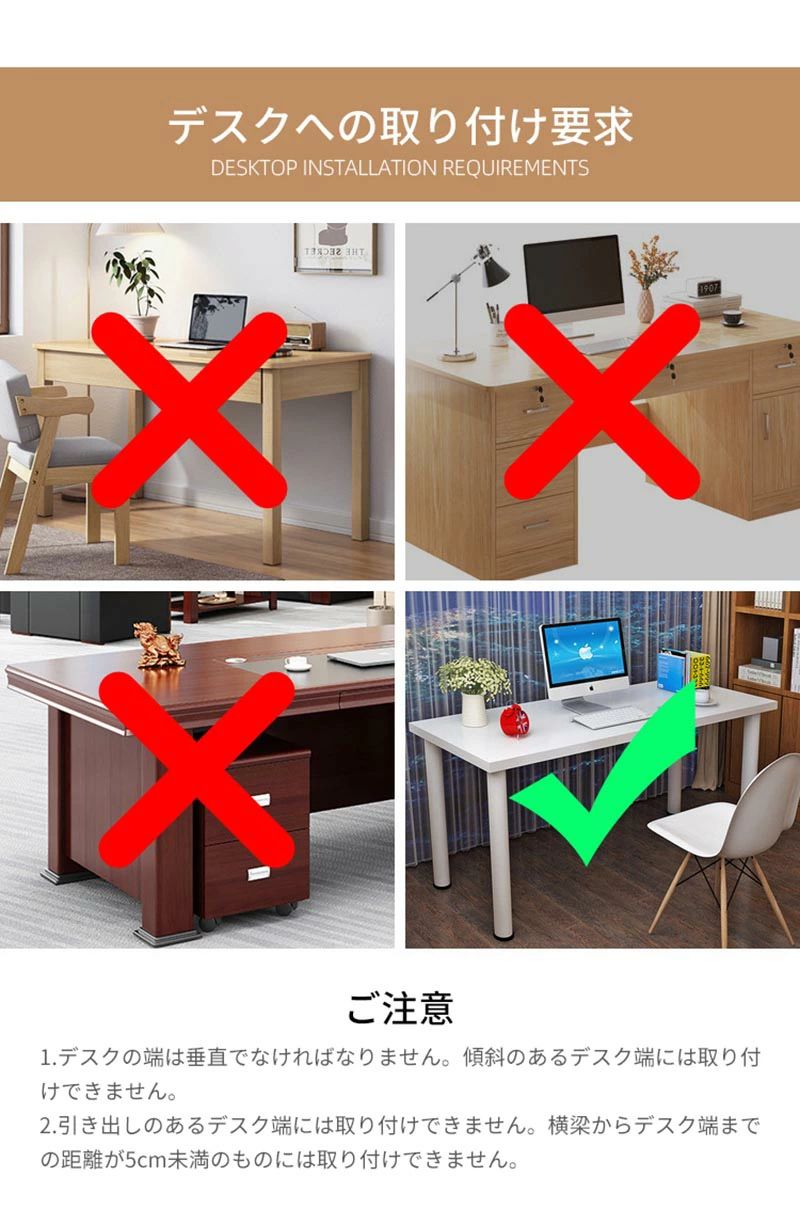 デスクトップの厚みが4cmを超える場合には本製品を取り付けることはできません。