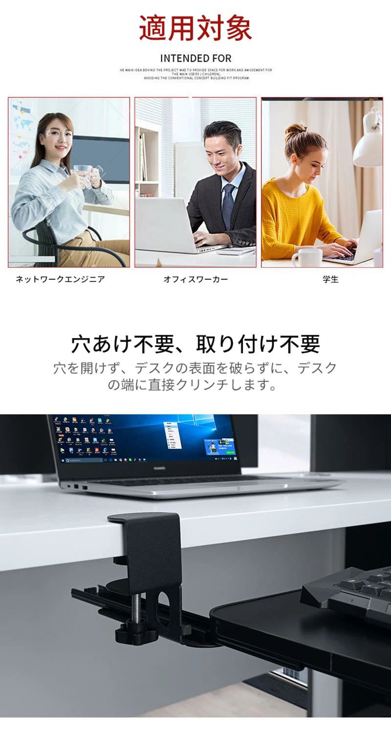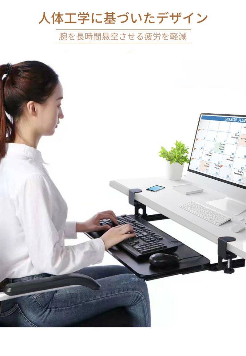 非常に頑丈なCクランプにより、デスクにダメージを与えることなくワークステーションにキーボードトレイを安全に取り付けます。