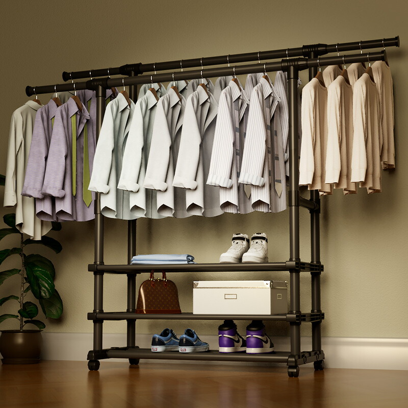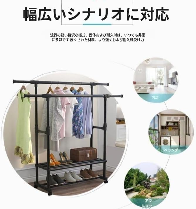 ハンガーラック 高さ伸縮パイプ 室内物干し ダブル パイプハンガー クローゼット コートハンガー 衣類ラック おしゃれ コート掛け 省スペース 衣類収納 防サビ 耐腐食性 ダブルポール式 下駄箱 防水