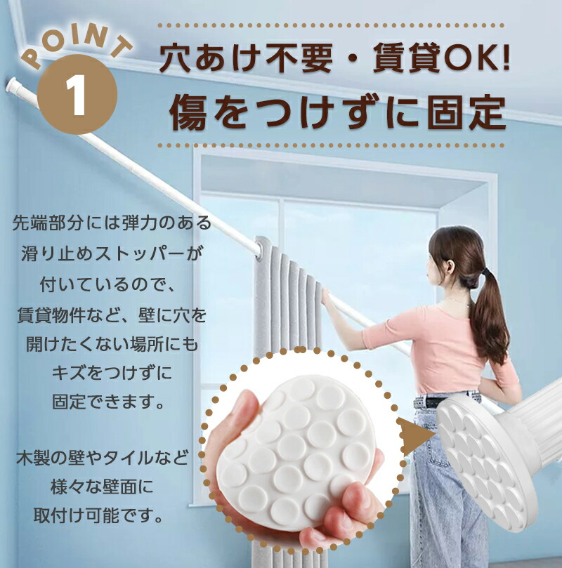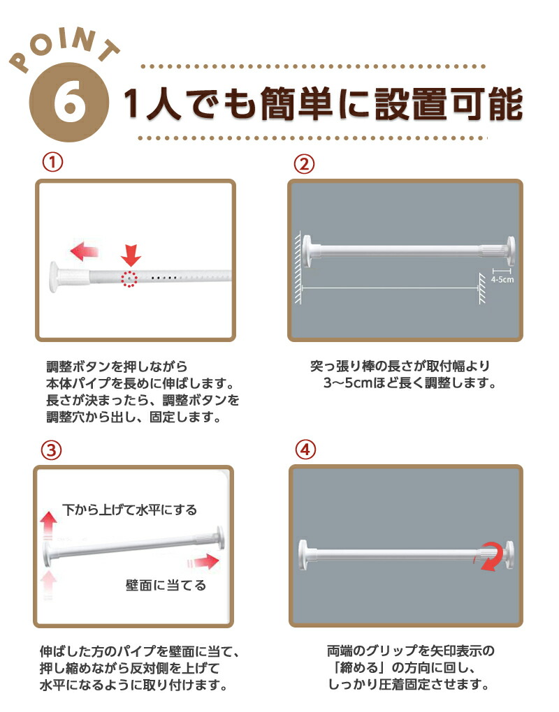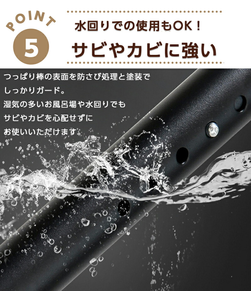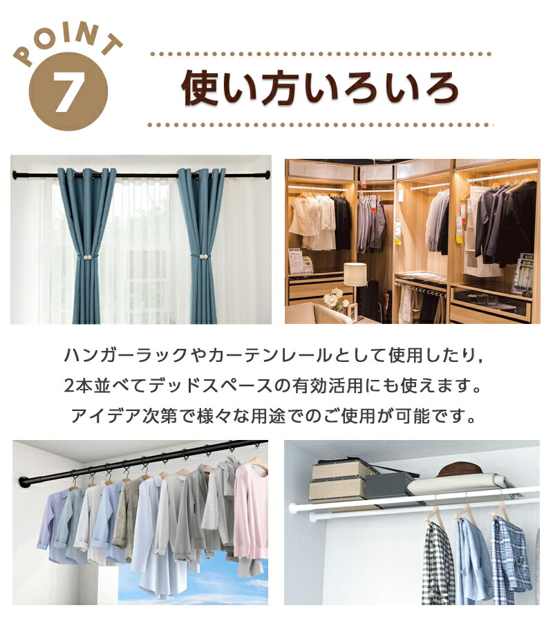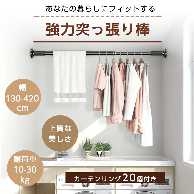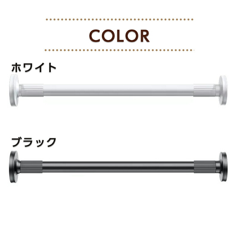 商品紹介高強度バネが内蔵されている強力タイプの突っ張り棒です。 炭素鋼製のパイプはサビに強く、強い負荷に耐えられます。 様々な壁に使え、お家の中のデッドスペースを利用して収納力をアップできます。 収納スペースの少ない一人暮らしの方にもおすすめです。 クローゼットロッド、浴室用タオル掛け、室内用カーテンロッド、シャワーカーテンロッド、 物干し竿、キッチン用品収納として、、 アイデア次第でいろいろな使い方ができます。 クローゼットやキッチン、ランドリーなど様々な場所で大活躍しますよ。