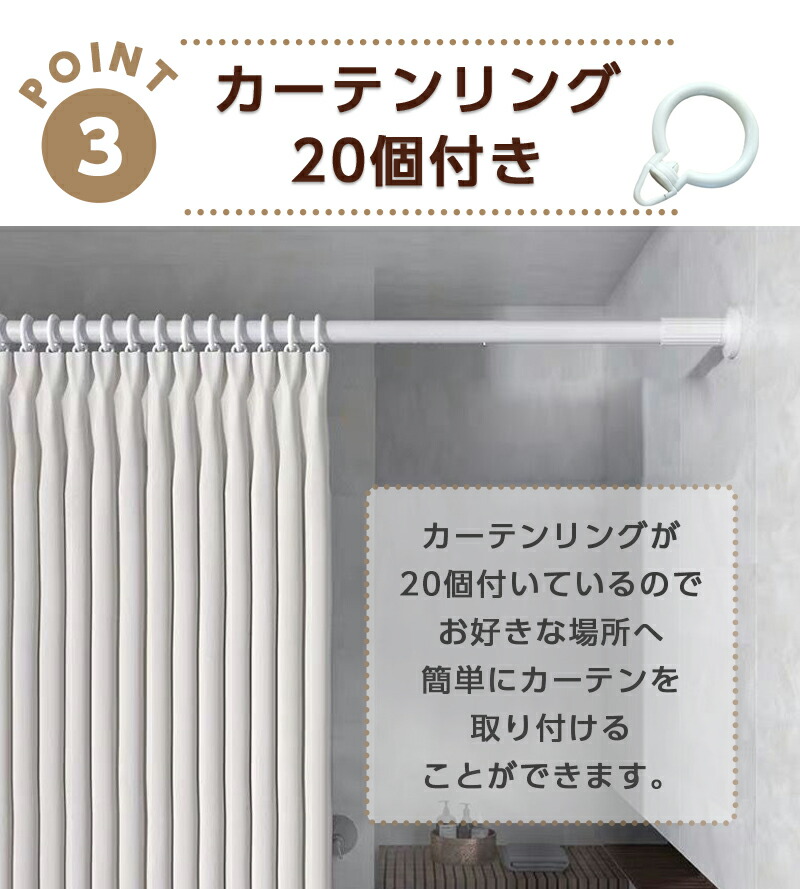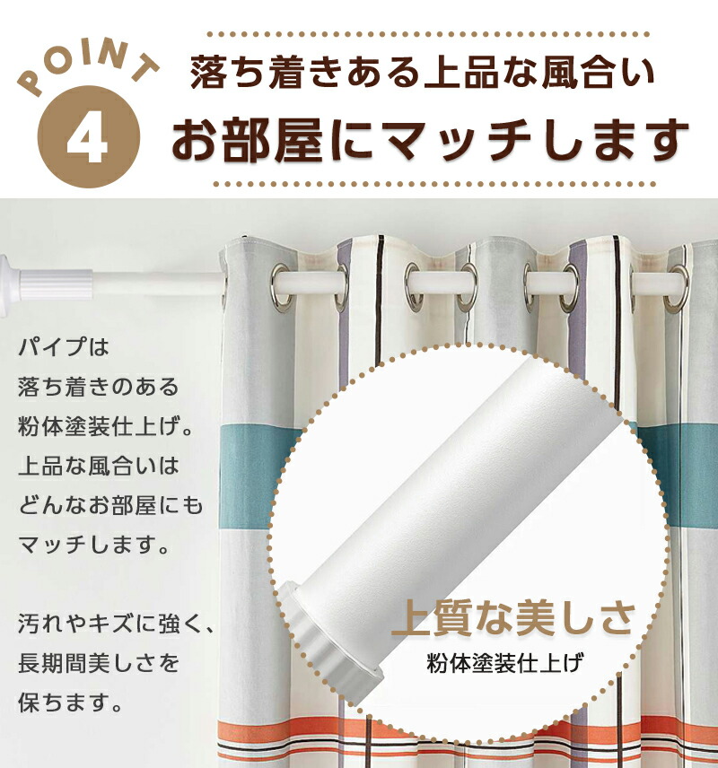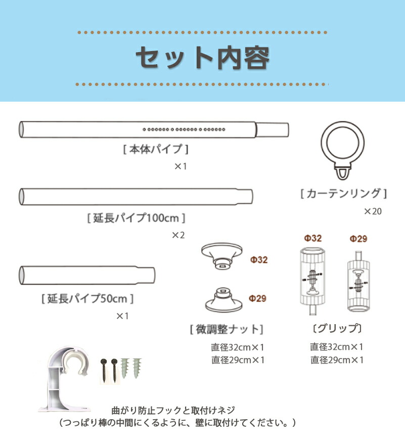 商品詳細セット内容 本体パイプ×1、 延長パイプ50cm×1、延長パイプ100cm×2、 微調整ナット×2、圧着板×2、 カーテンリング×20、 曲がり防止フックと取り付けネジ パイプ直径:29/32mm 耐荷重:10~30kg 設置する長さで変わりますので、伸縮が少ない方がより荷重能力が優れます。 材質:炭素鋼、ABS 重量:約2.3kg
