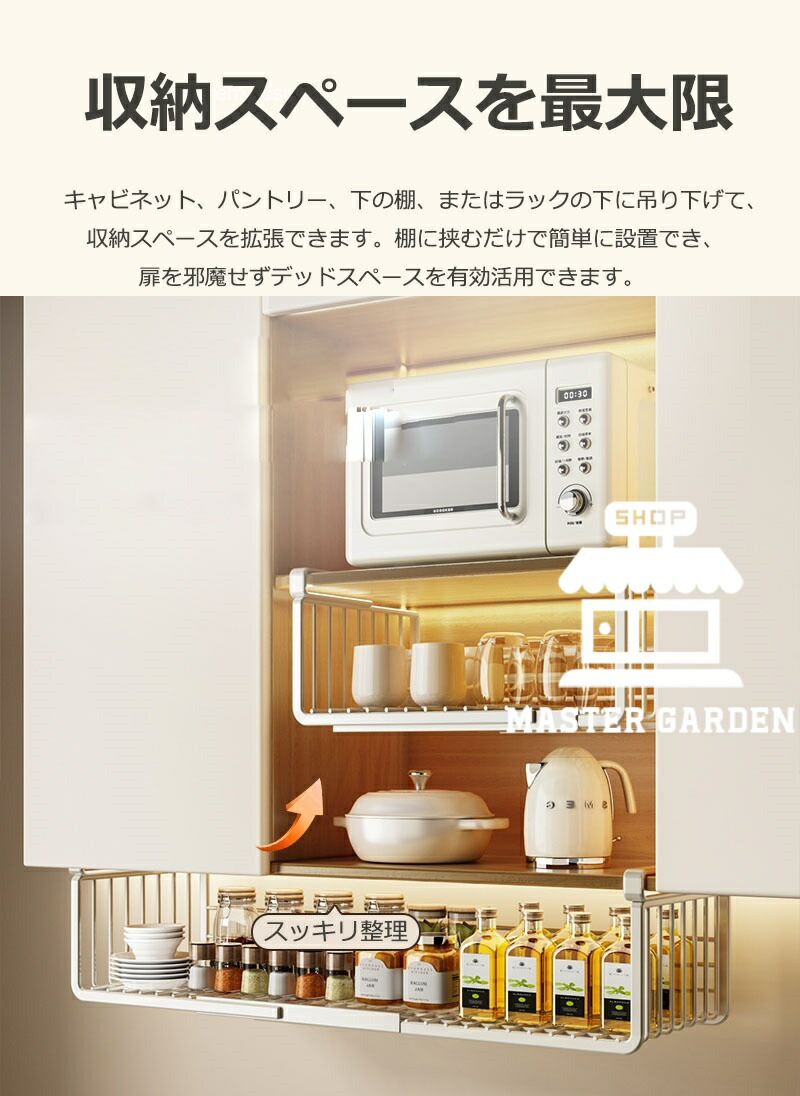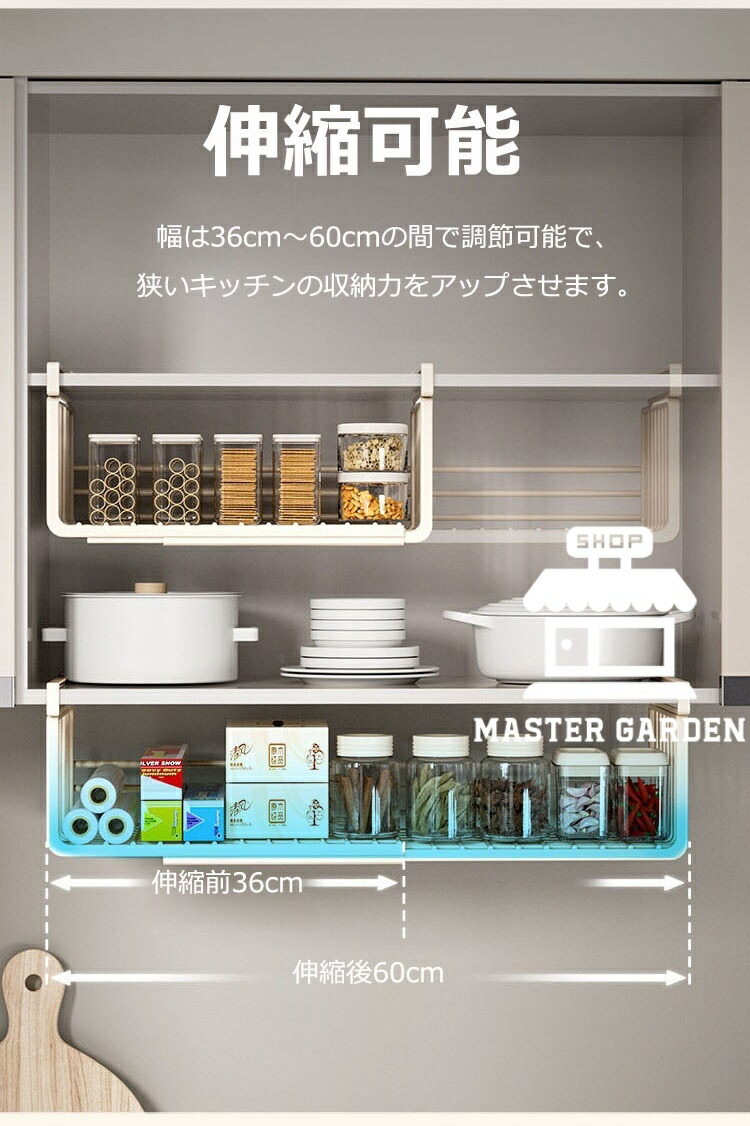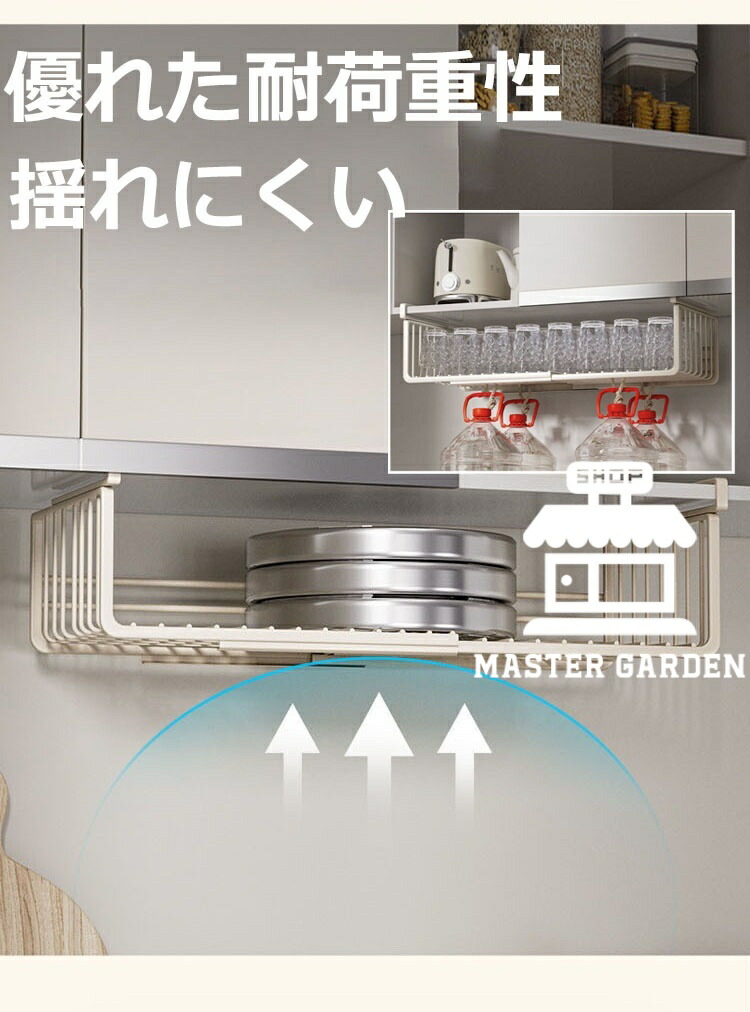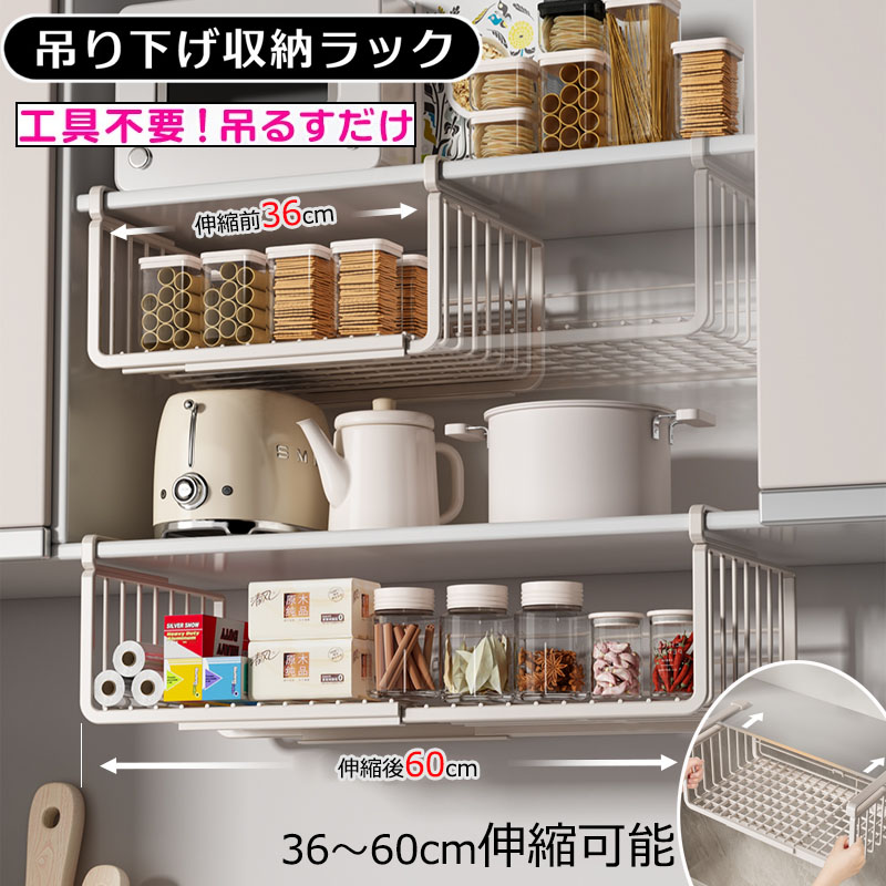 吊り下げ収納ラック 吊り下げ収納 戸棚下収納ラック 伸縮可能 工事不要 滑り止め設計 デスク下 キッチンラック 吊り戸棚下ラック 小物収納 棚下収納 多機能ラック 収納 スペース有効活用 隙間 掛け式