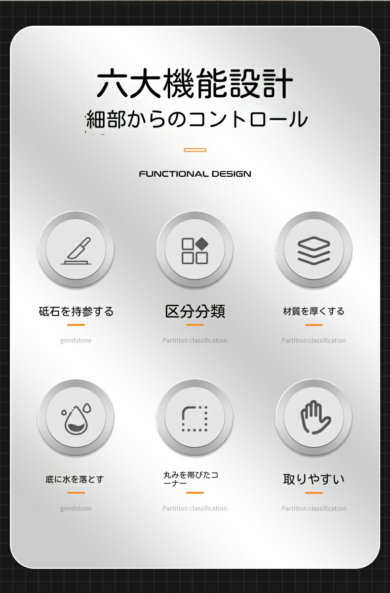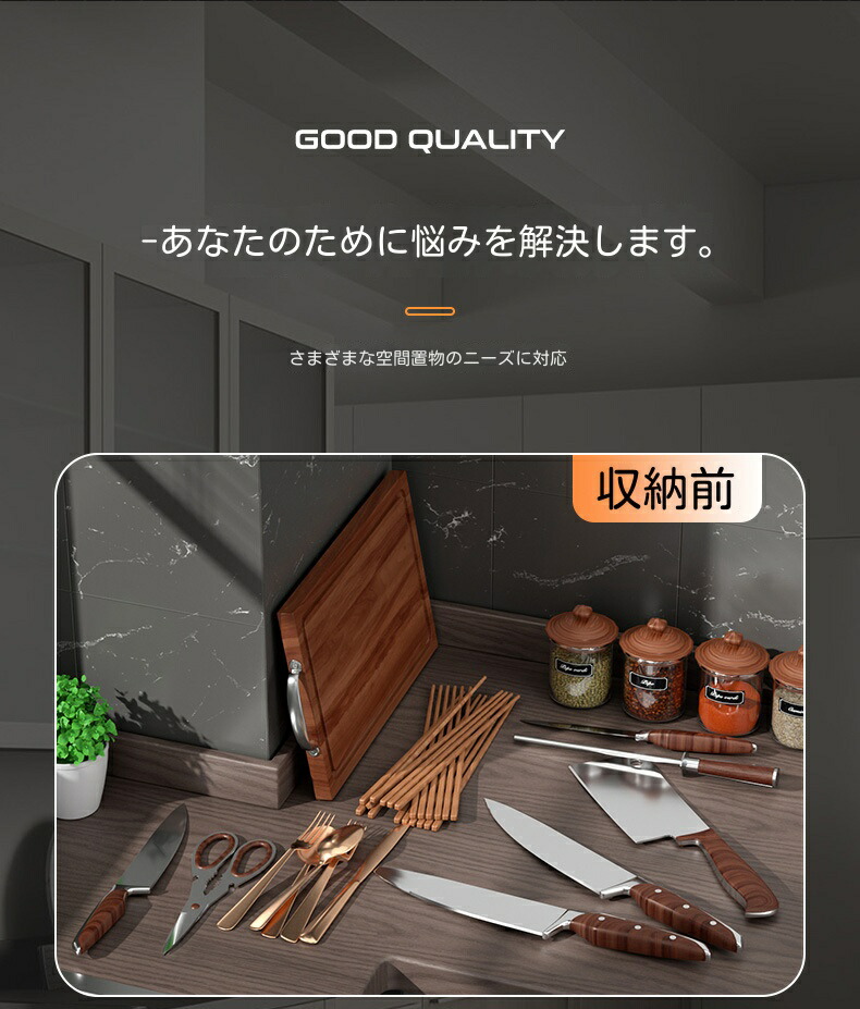 【頑丈で錆びにくい】まな板包丁スタンド本体は焼け塗装施したステンレス炭素鋼製で、錆びにくく耐久性に優れて安定感があります。箸立てと水受けトレイ部分はPP素材、水切りが簡単で錆びる心配もありません。