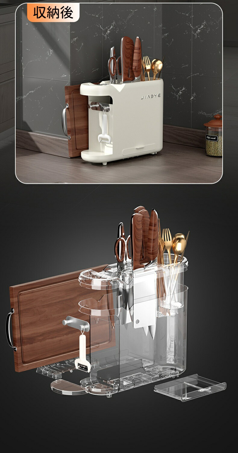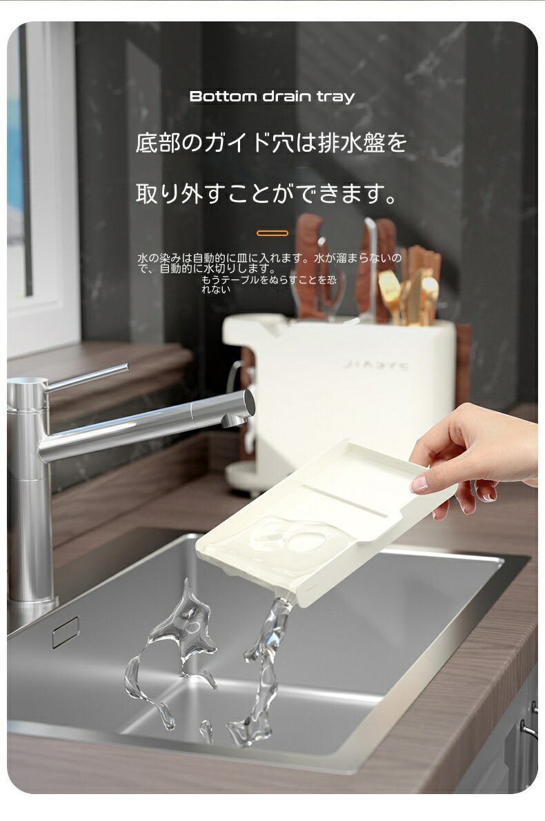 【収納しながら水切り可能】包丁差しの四方は通気性がよく、素早く乾燥させ、水切りをして清潔に保つことができます。底部は水を受けるトレイが付き、引き出し式で取出しが便利、いつでも清潔にご使用いただけます。お箸立ての底部も小さな穴があり、通気性が良く水切り簡単になり、脱着式で汚れたら簡単に取り外して水洗いできます。