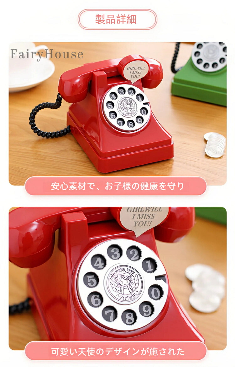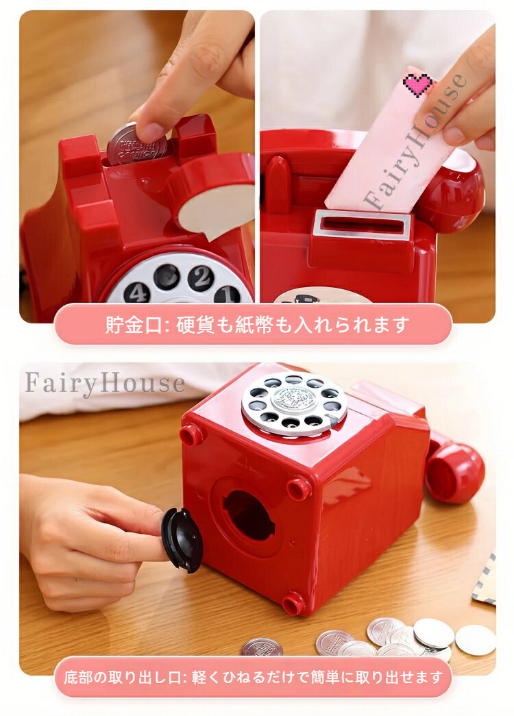 貯金箱 電話をかたどった おしゃれ マネーバンク 子供 硬貨 コイン お札 紙幣 家型 可愛い 飾り付き 金庫 おもちゃ 大容量 小銭投入ボックス お金 お年玉 子ども 置き物 収納装飾 コインバンク