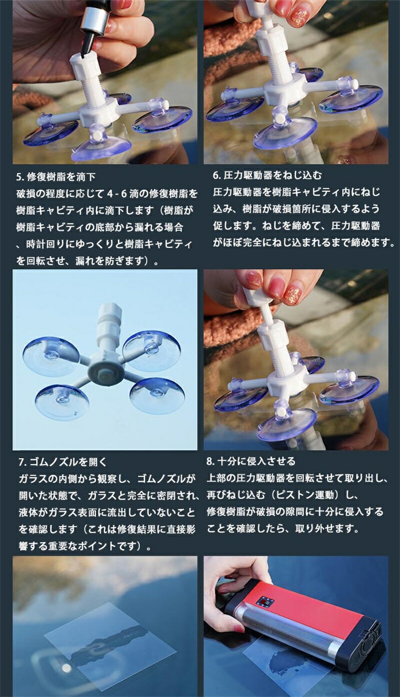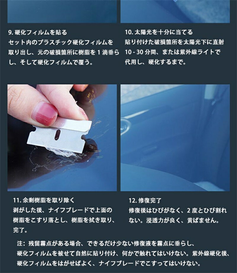 当キットに搭載された専用修復液は、微細な割れ目や欠けに接触する瞬間から活性化し、高速ですべての隙間を充填します。たった紫外線ランプで10-30分間で化学反応による架橋処理が完了し、ガラスの構造的強度を回復するだけでなく、外観も新品同様に美しく修復します。