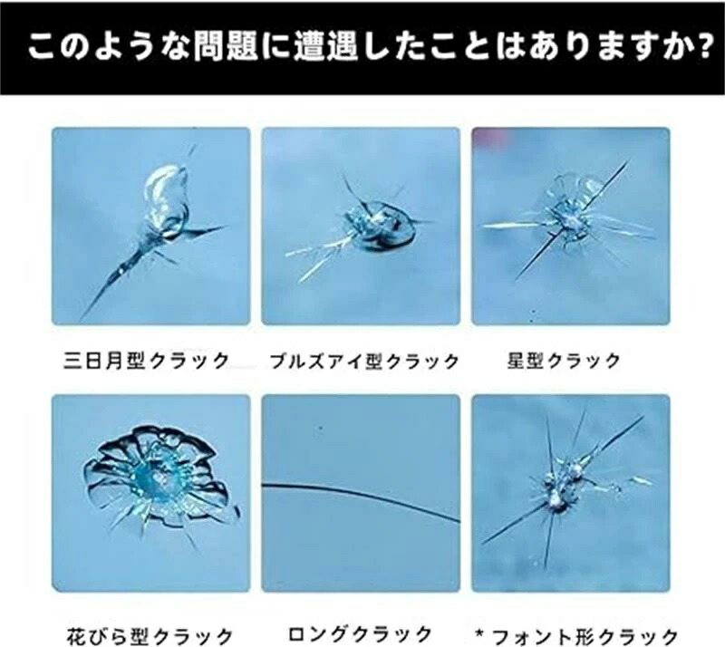 小さな欠け、バラ形割れ、星型クラック、半月型の亀裂、最大 30cm(直径 1 インチ)までの長さの割れなど、さまざまな損傷パターンに対応可能。ウインドシールドの損傷を 1 つのキットで解決できる包括的なソリューションです。