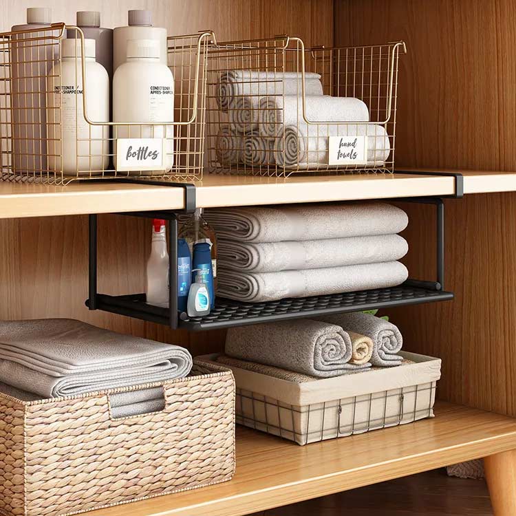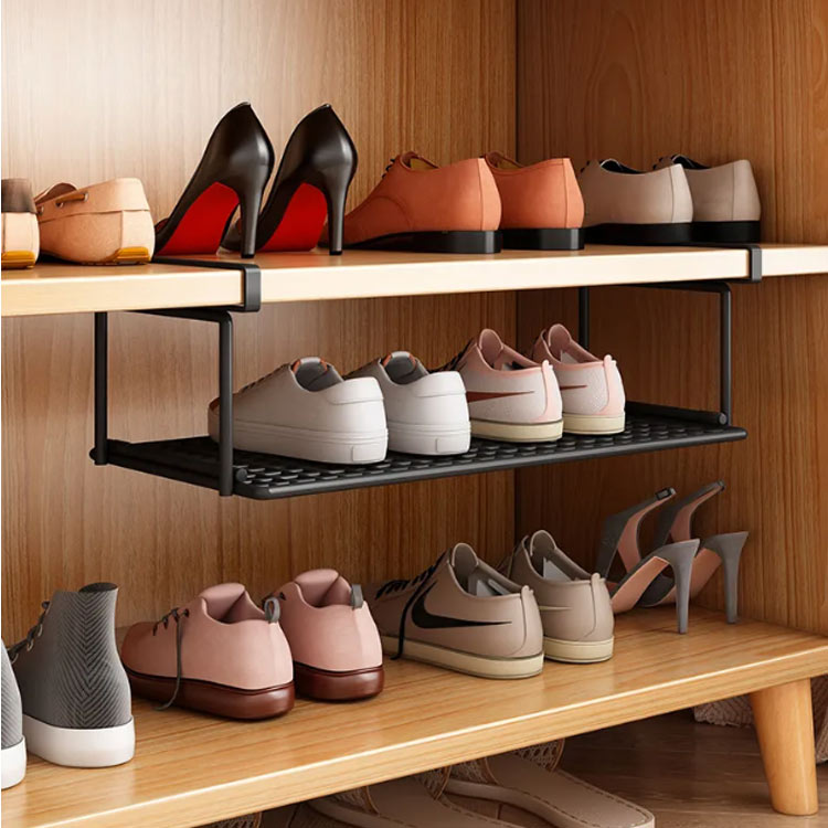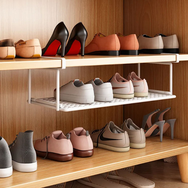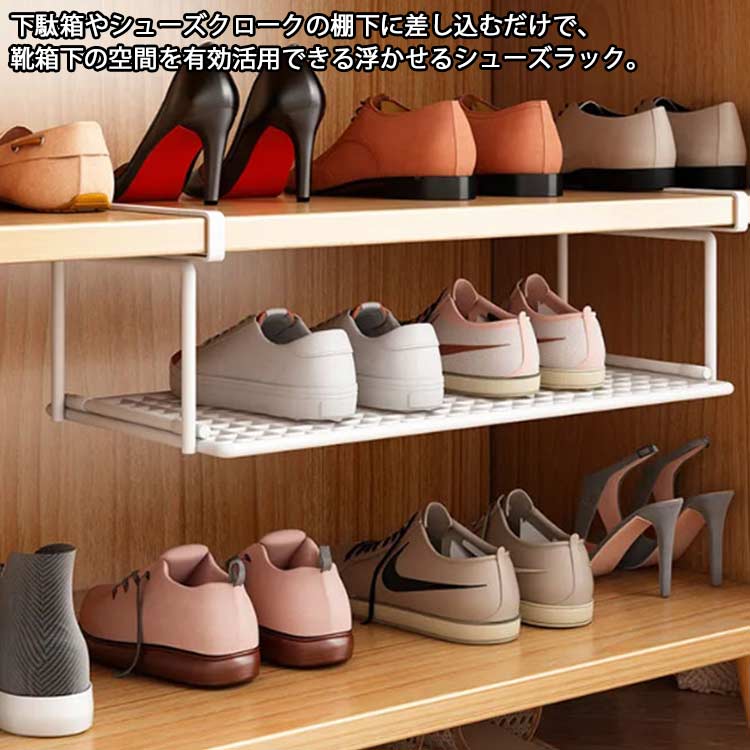 下駄箱やシューズクロークの棚下に差し込むだけで、靴箱下の空間を有効活用できる浮かせるシューズラック。