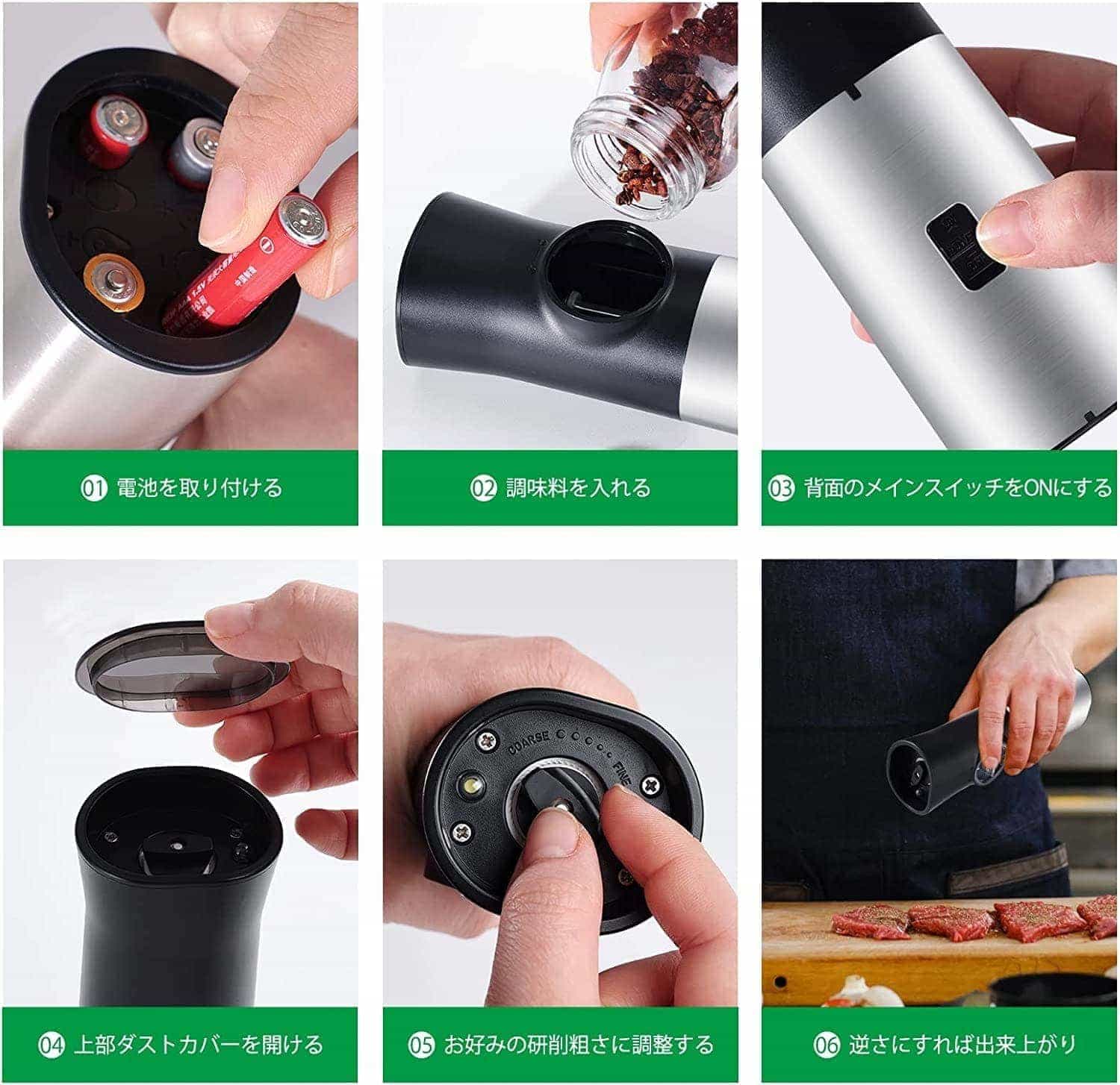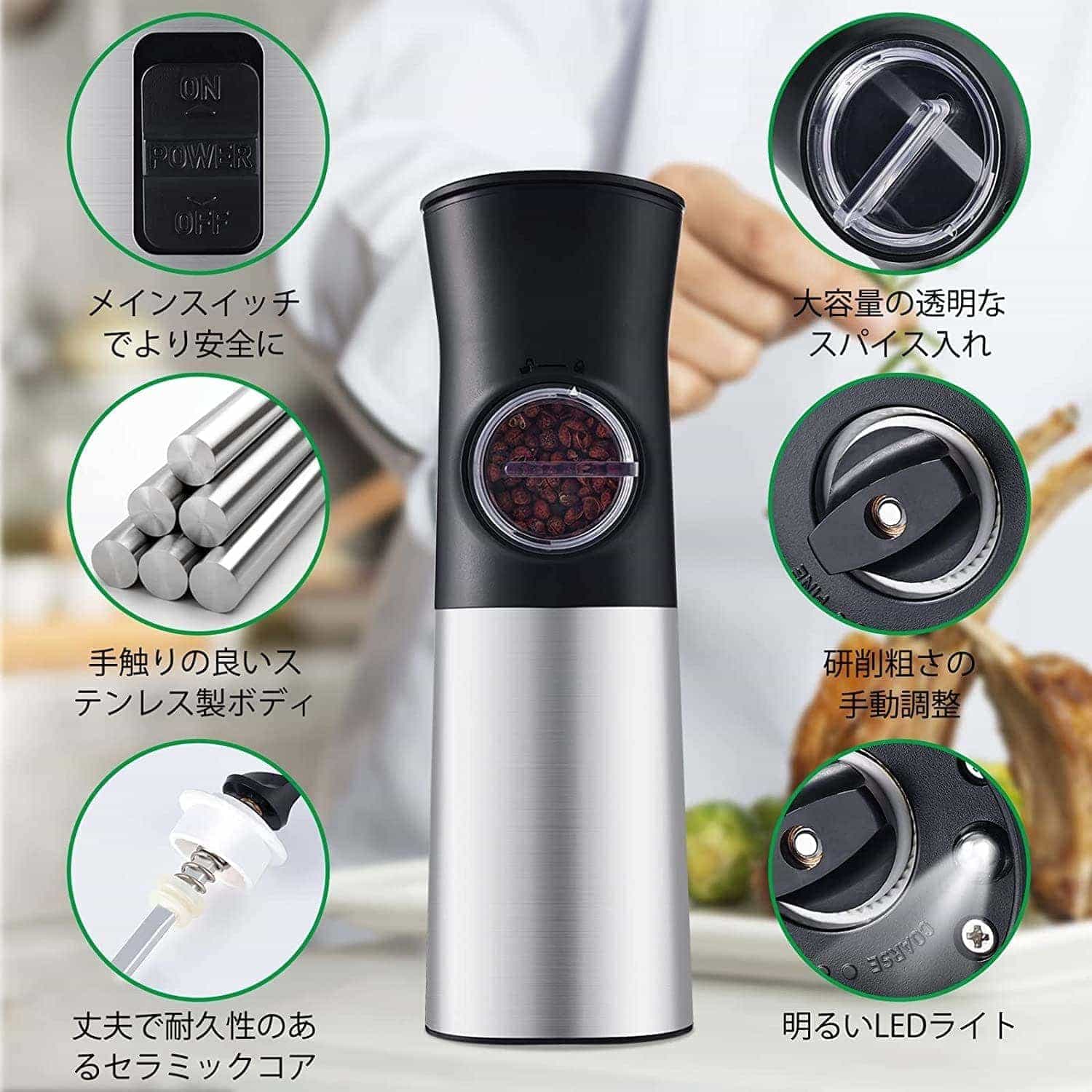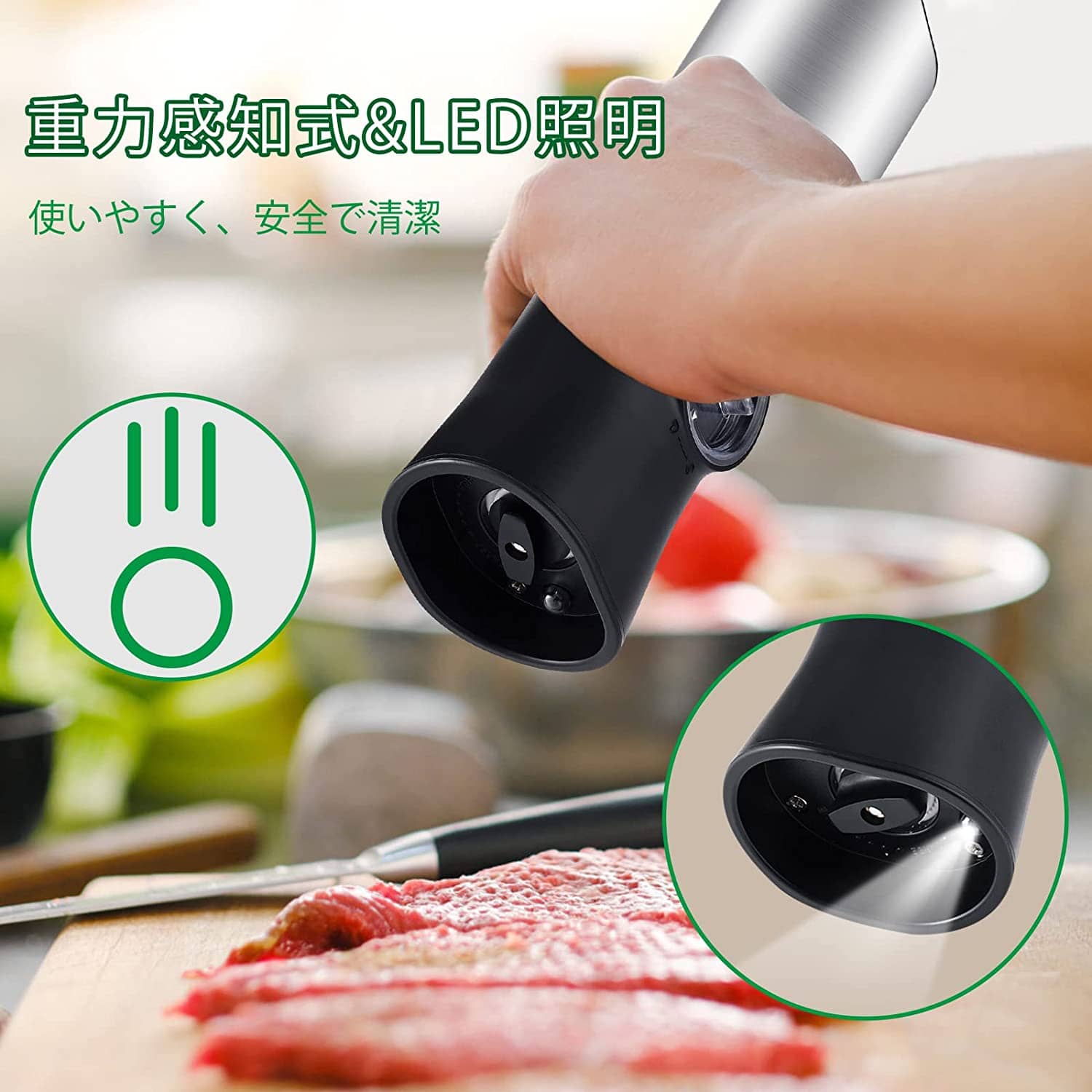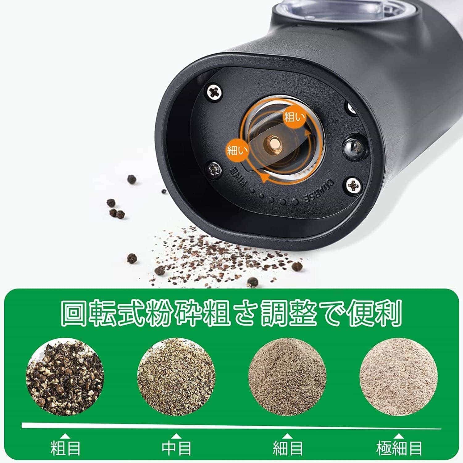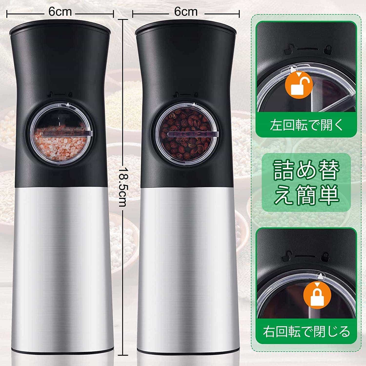 【2個セットとライト付き】 2個セットで、ベツベツに分けて挽い、家庭用もレストラン用も便利。底部にLEDライトが付き、光の足りない時も使えます、調味料をより鮮明に見ることができ、より美味しい料理作りをサポートします。
