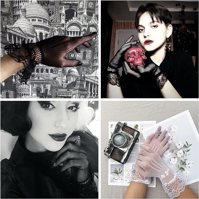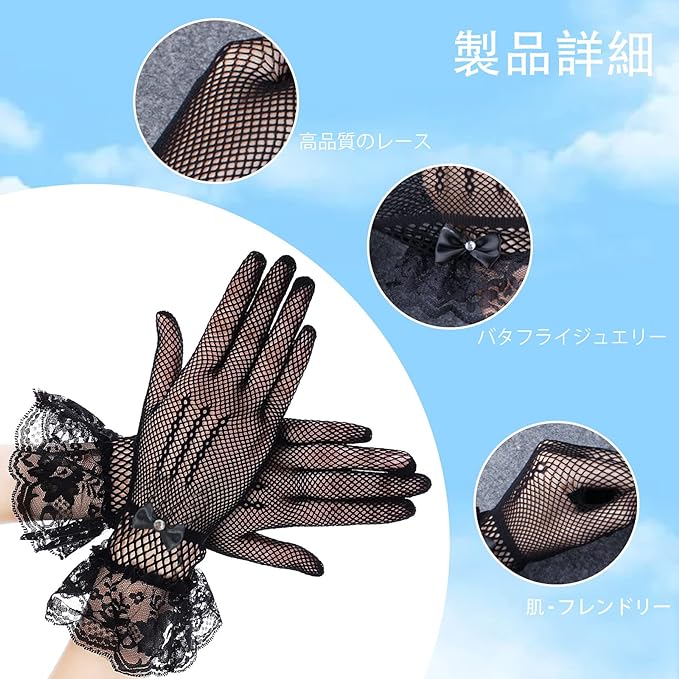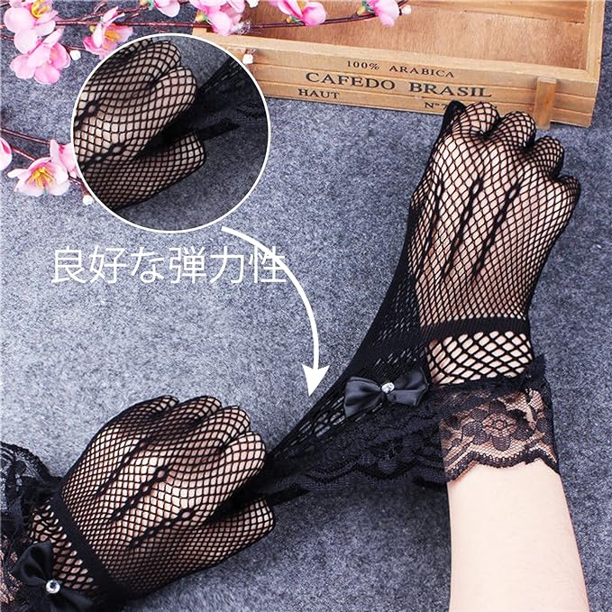 【サイズ・素材】長さ23cm*幅8cm 伸縮性があるので、手にフィットしやすい。メッシュ生地、レース、リボンで作られたグローブは肌触りがいい。