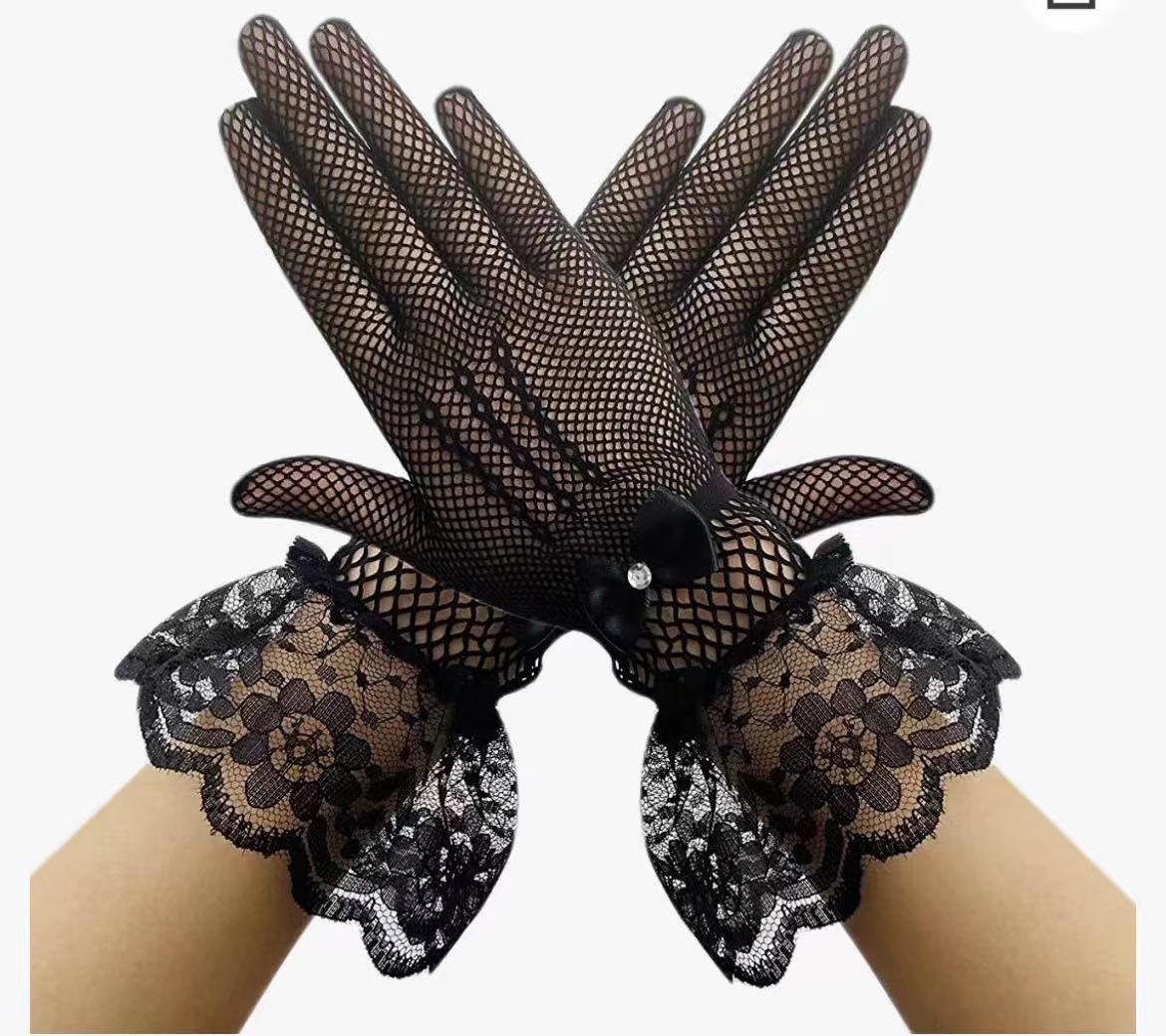 【レディース手袋】おしゃれでファッション性の高いレディース用手袋です。メッシュタイプの手袋にレースとリボンがアクセントとして飾っています。ドレスや衣装をより華やかに!
