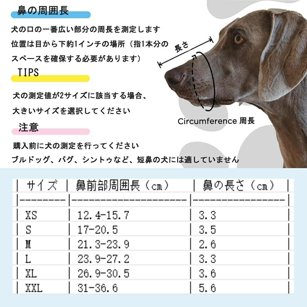 【サイズ】XS-XXL。購入前に、鼻から首と口までの周囲を測定してください。犬の場合も、鼻から首と口までの周囲を測定することをおすすめします。