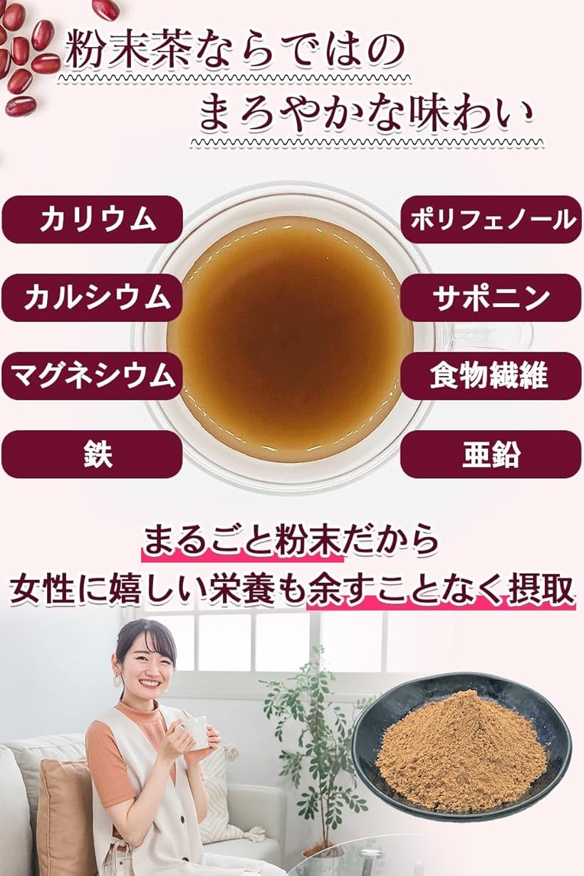 v「栄養丸ごと粉末タイプ」粉末タイプなので、カリウム をはじめ、カルシウム、マグネシウム、鉄、亜鉛、ポリフェノール、サポニン、食物繊維などのあずきの栄養が丸ごと摂取できます。