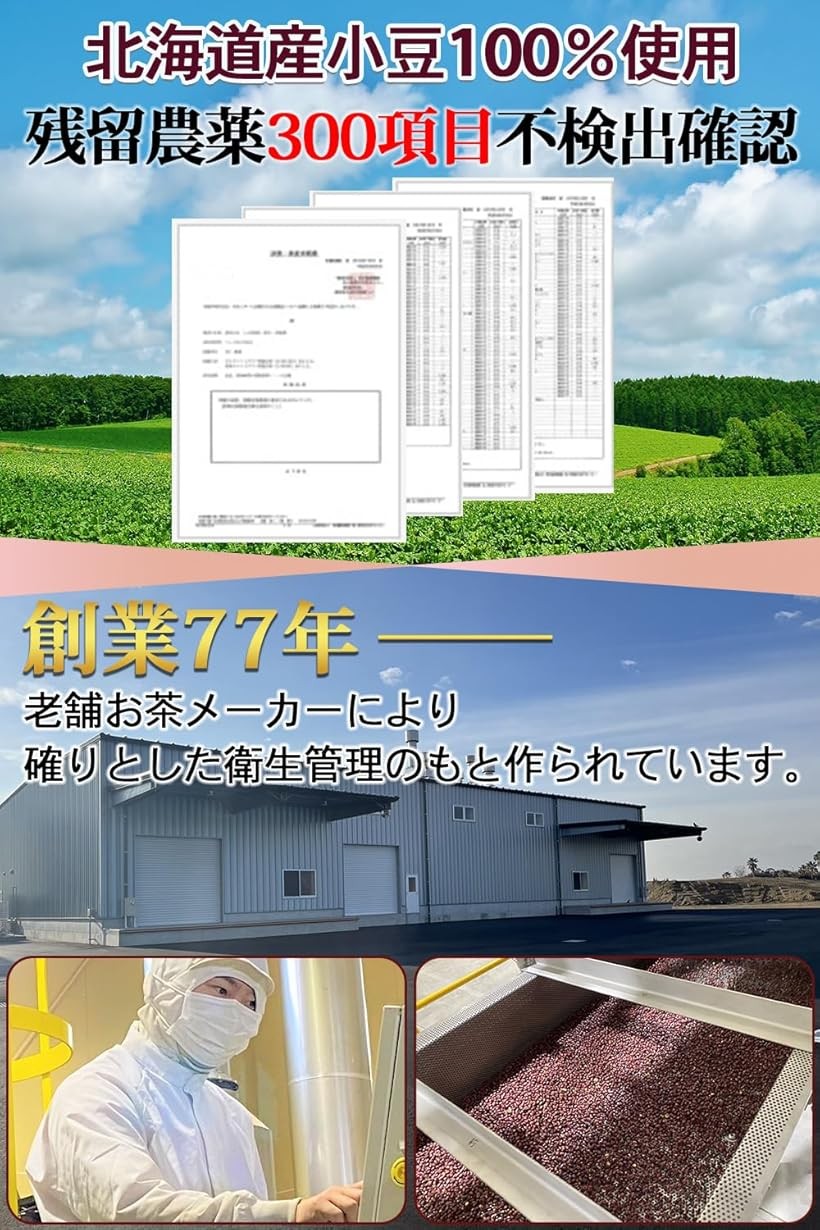 v「あずきの香り・風味が確り」通常の焙煎だけでなく、蒸気により蒸し上げてからじっくり焙煎する独自製法(蒸し上げ焙煎)を採用。