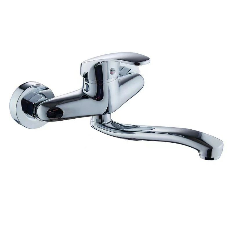 【特徴】壁付き キッチン用シングルレバー混合栓 クロームメッキ&真鍮 吐水口は360°に回転可能。